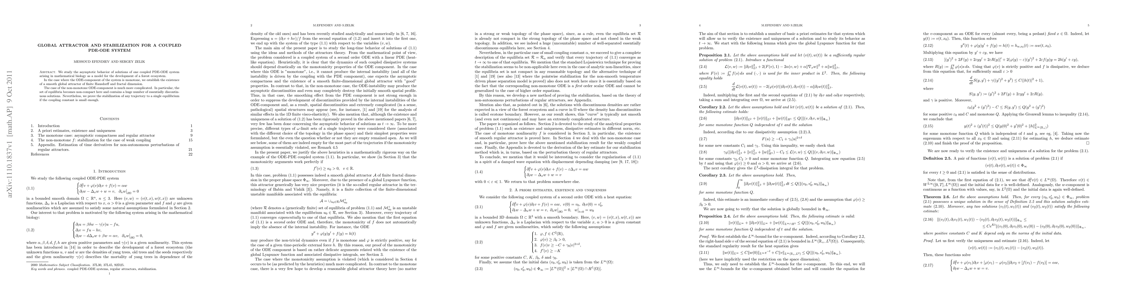This paper investigates the asymptotic behavior of a coupled PDE-ODE system modeling forest ecosystem development. It establishes a smooth global attractor for the monotone ODE component, while proving stabilization to a single equilibrium for non-monotone components when the coupling is sufficiently weak.