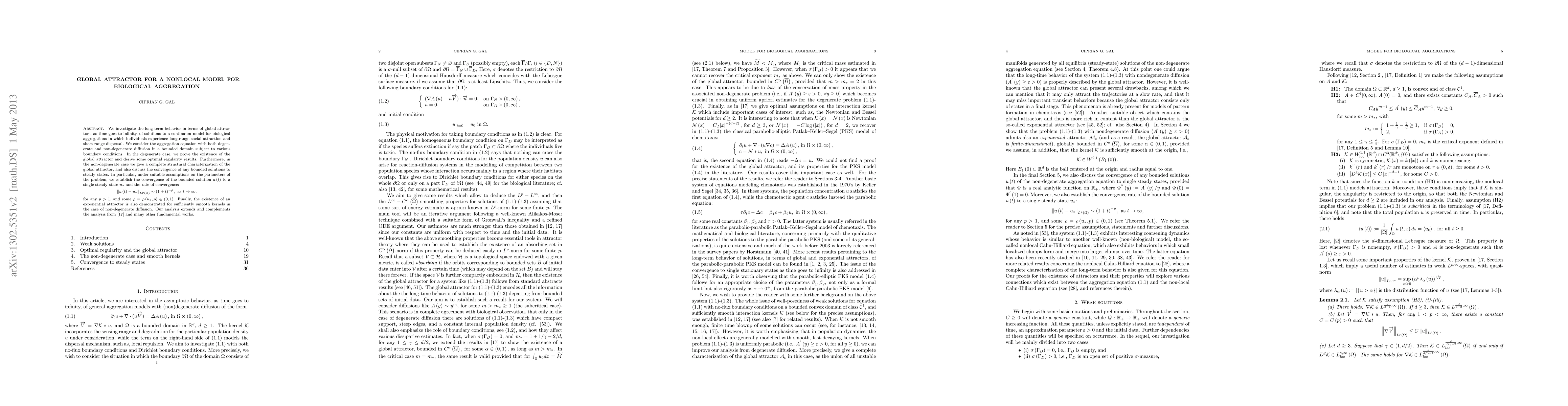 Researchers investigated a model for biological aggregations with long-range social attraction and short-range dispersal, finding global attractors and optimal regularity results in both degenerate and non-degenerate cases.