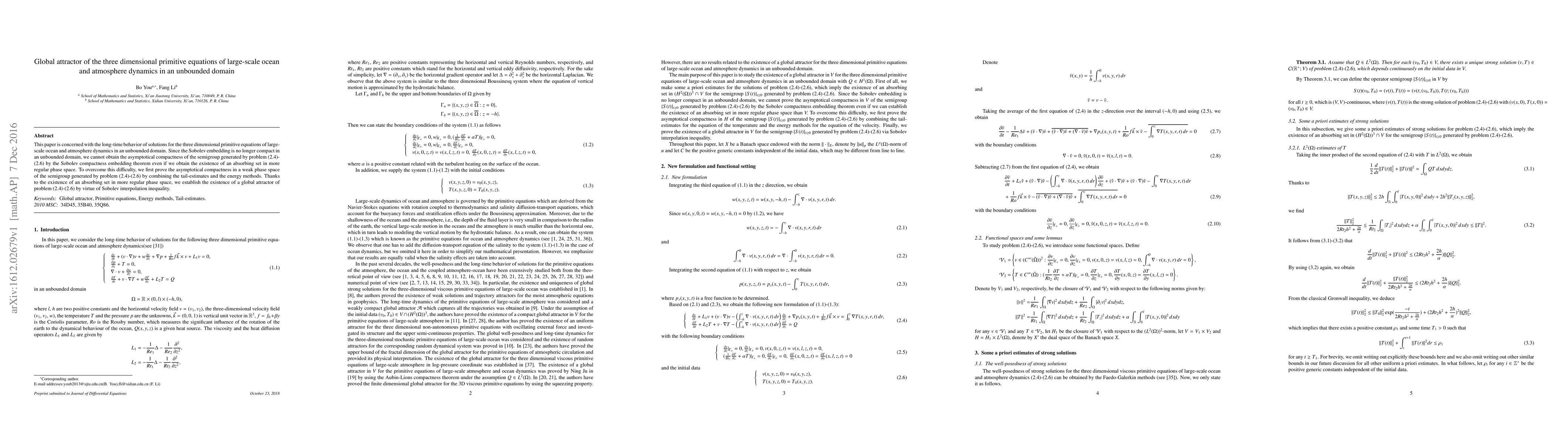 This paper investigates the long-term behavior of solutions for the three-dimensional primitive equations of ocean and atmosphere dynamics in an unbounded domain, establishing the existence of a global attractor through asymptotic compactness in a weak phase space and the use of Sobolev interpolation inequality.