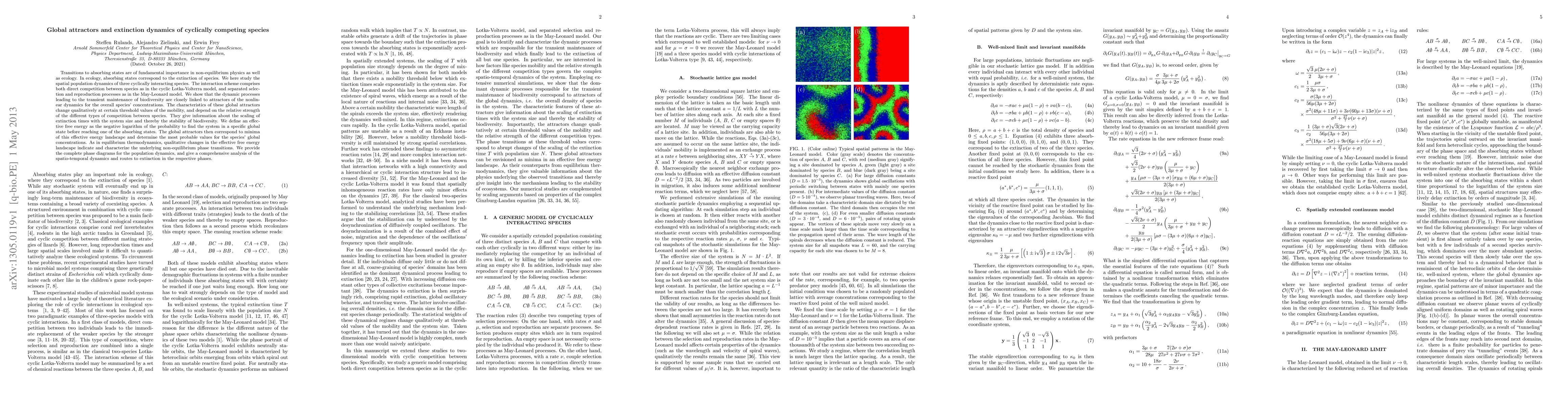 This paper investigates the dynamics of three cyclically competing species, revealing how global attractors influence biodiversity maintenance and extinction. It finds that changes in mobility and competition strength alter the effective free energy landscape, leading to distinct phase transitions and extinction routes.
