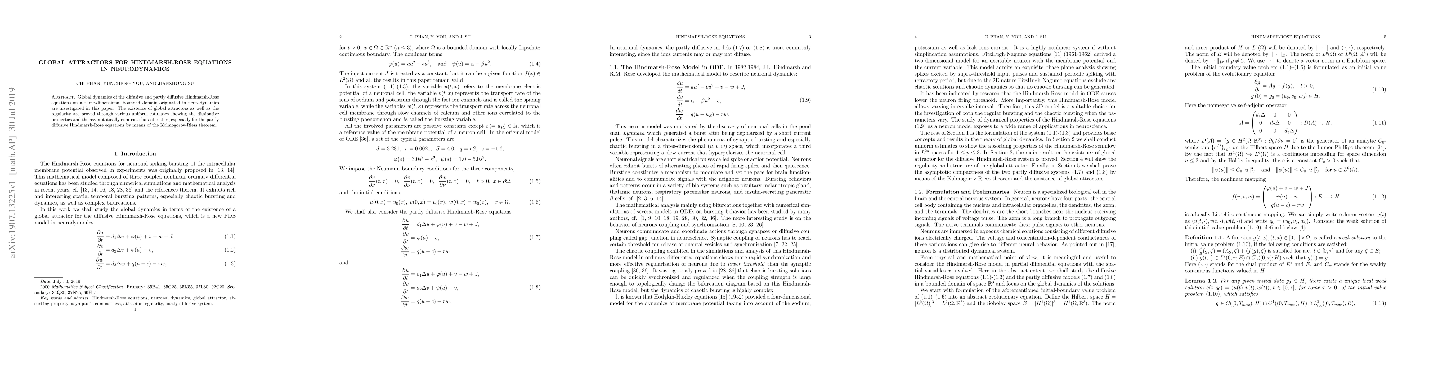 This paper investigates the global dynamics of the Hindmarsh-Rose equations in neurodynamics, proving the existence of global attractors and their regularity through uniform estimates that demonstrate dissipative properties and asymptotic compactness, particularly for the partly diffusive variant using the Kolmogorov-Riesz theorem.