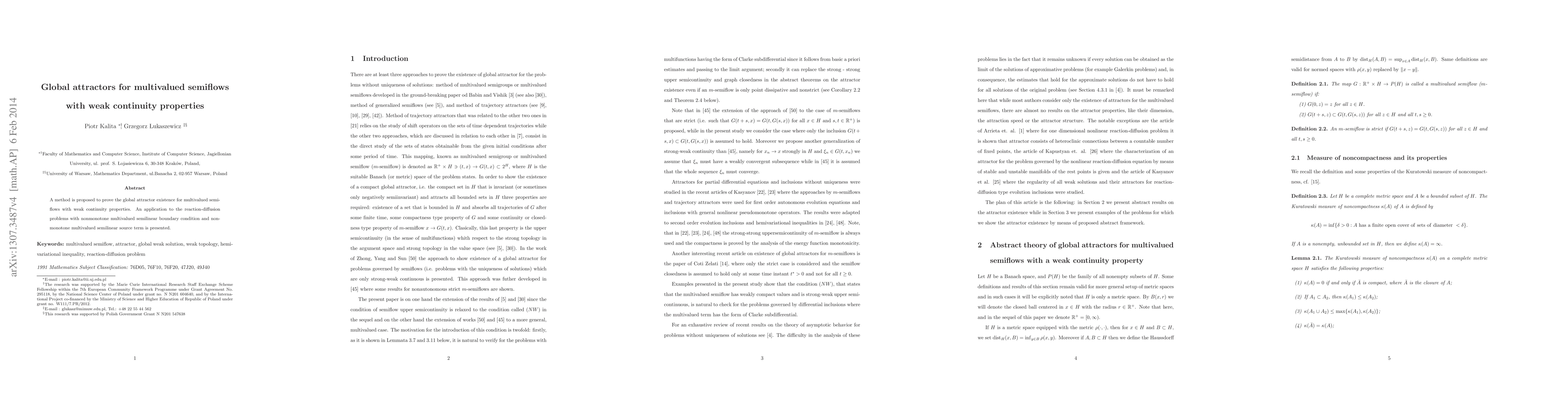 A method is proposed to deal with some multivalued semiflows with weak continuity properties. An application to the reaction-diffusion problems with nonmonotone multivalued semilinear boundary condition and nonmonotone multivalued semilinear source term is presented.