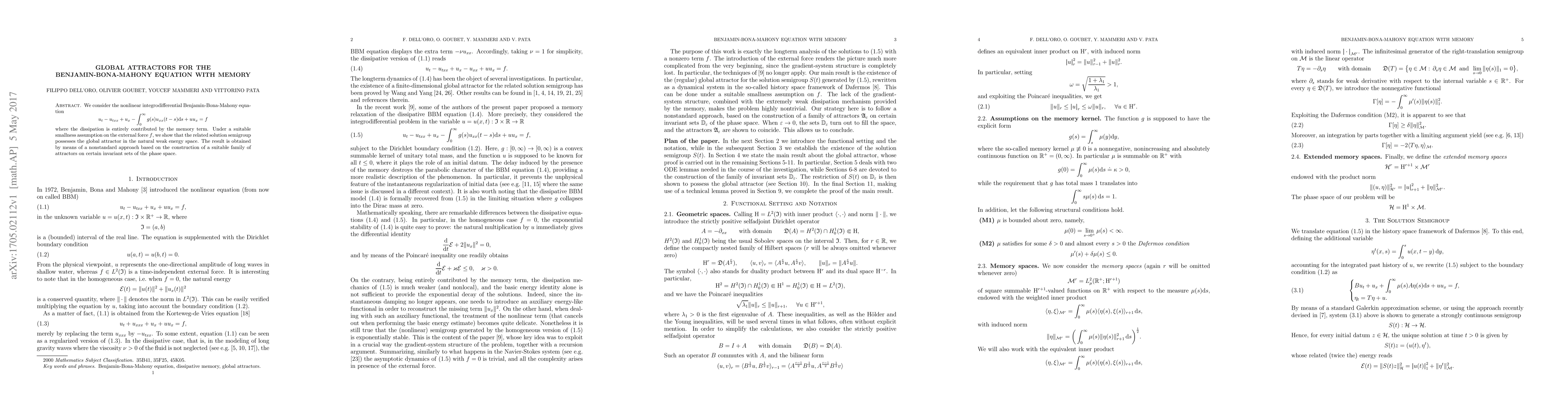 We consider the nonlinear integrodifferential Benjamin-Bona-Mahony equation $$ u_t - u_{txx} + u_x - \int_0^\infty g(s) u_{xx}(t-s) {\rm d} s + u u_x = f $$ where the dissipation is entirely contributed by the memory term. Under a suitable smallness assumption on the external force $f$, we show that the related solution semigroup possesses the global attractor in the natural weak energy space. The result is obtained by means of a nonstandard approach based on the construction of a suitable family of attractors on certain invariant sets of the phase space.