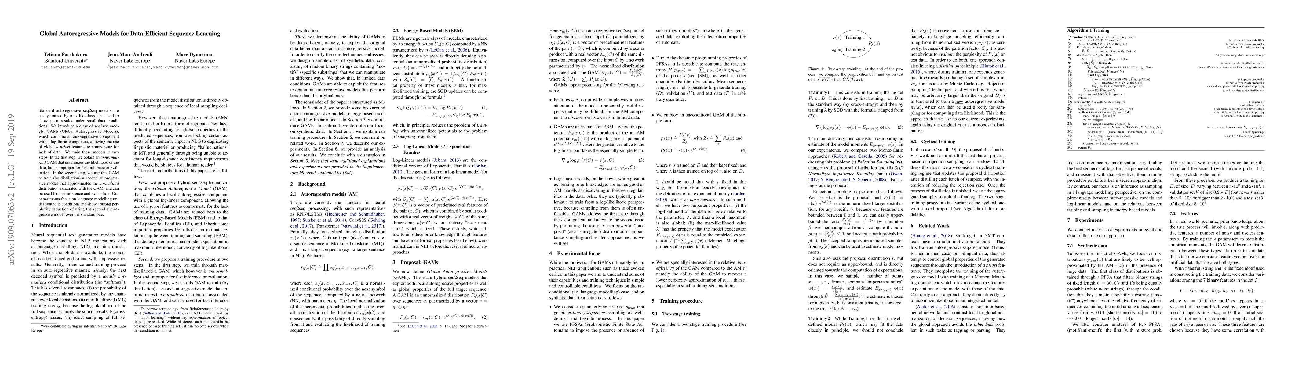 Standard autoregressive seq2seq models are easily trained by max-likelihood, but tend to show poor results under small-data conditions. We introduce a class of seq2seq models, GAMs (Global Autoregressive Models), which combine an autoregressive component with a log-linear component, allowing the use of global \textit{a priori} features to compensate for lack of data. We train these models in two steps. In the first step, we obtain an \emph{unnormalized} GAM that maximizes the likelihood of the data, but is improper for fast inference or evaluation. In the second step, we use this GAM to train (by distillation) a second autoregressive model that approximates the \emph{normalized} distribution associated with the GAM, and can be used for fast inference and evaluation. Our experiments focus on language modelling under synthetic conditions and show a strong perplexity reduction of using the second autoregressive model over the standard one.