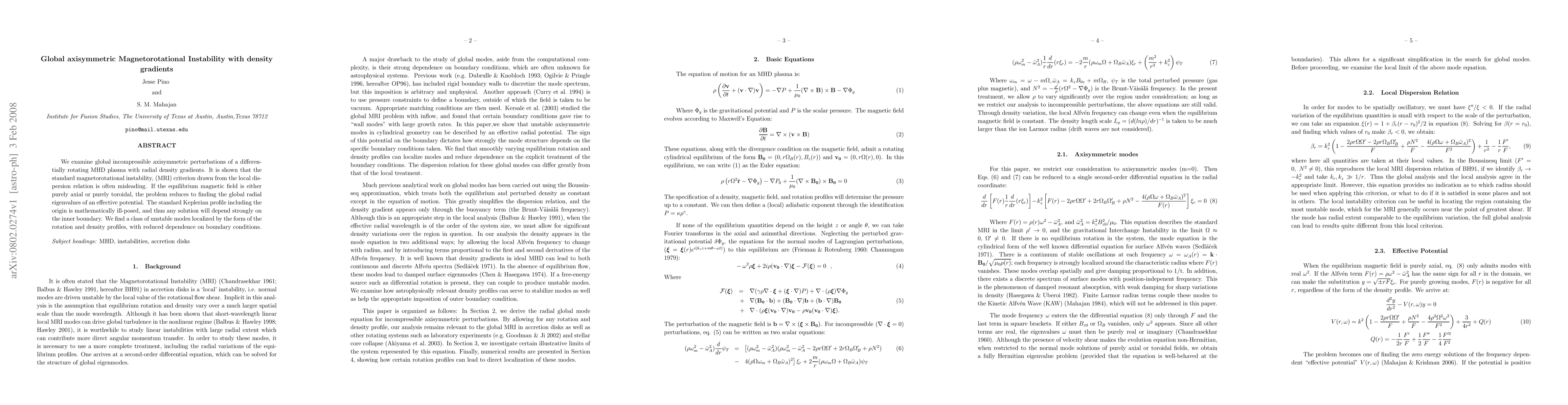 We examine global incompressible axisymmetric perturbations of a differentially rotating MHD plasma with radial density gradients. It is shown that the standard magnetorotational instability, (MRI) criterion drawn from the local dispersion relation is often misleading. If the equilibrium magnetic field is either purely axial or purely toroidal, the problem reduces to finding the global radial eigenvalues of an effective potential. The standard Keplerian profile including the origin is mathematically ill-posed, and thus any solution will depend strongly on the inner boundary. We find a class of unstable modes localized by the form of the rotation and density profiles, with reduced dependence on boundary conditions.