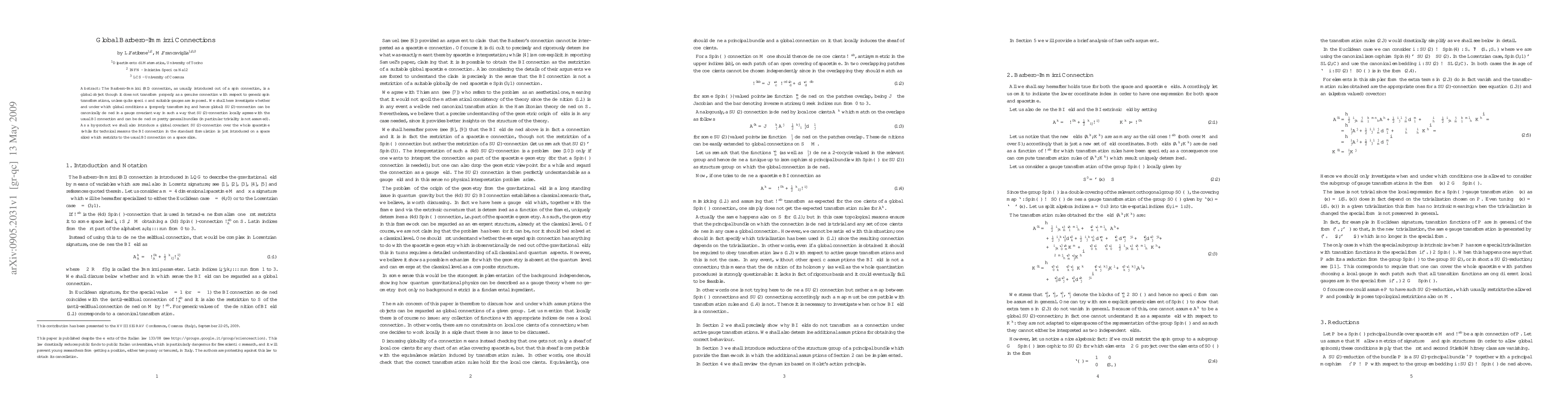 The Barbero-Immirzi (BI) connection, as usually introduced out of a spin connection, is a global object though it does not transform properly as a genuine connection with respect to generic spin transformations, unless quite specific and suitable gauges are imposed. We shall here investigate whether and under which global conditions a (properly transforming and hence global) SU(2)-connection can be canonically defined in a gauge covariant way in such a way that SU(2)-connection locally agrees with the usual BI connection and can be defined on pretty general bundles (in particular triviality is not assumed). As a by-product we shall also introduce a global covariant SU(2)-connection over the whole spacetime (while for technical reasons the BI connection in the standard formulation is just introduced on a space slice) which restricts to the usual BI connection on a space slice.