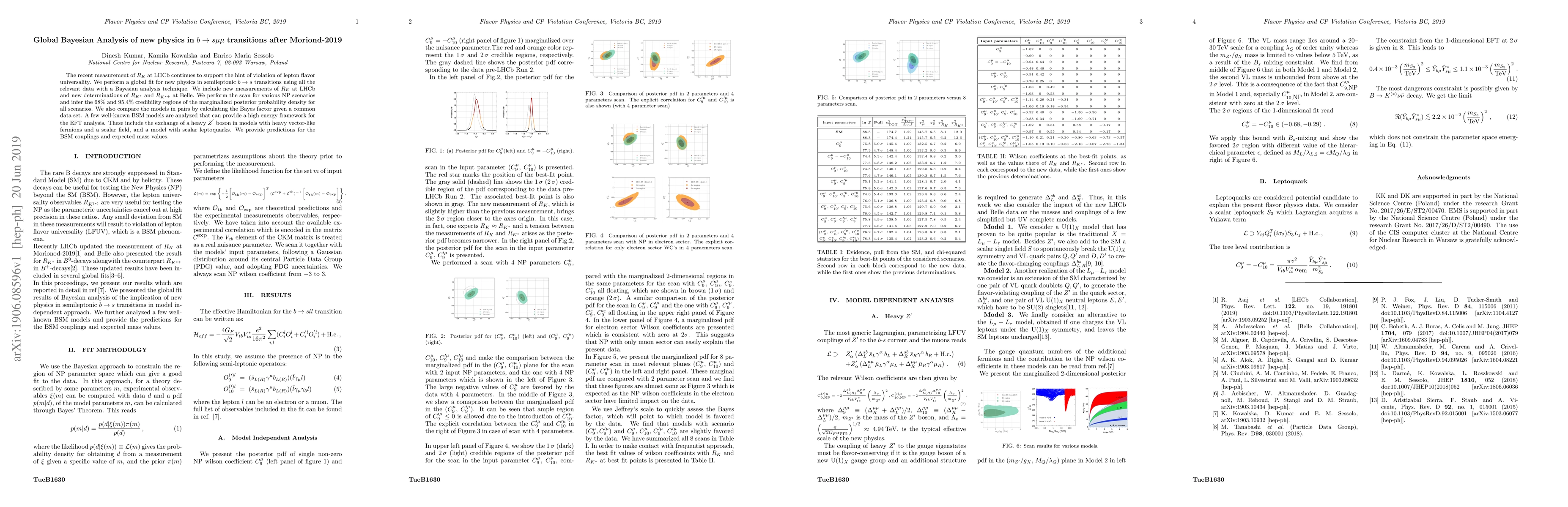 The recent measurement of $R_K$ at LHCb continues to support the hint of violation of lepton flavor universality. We perform a global fit for new physics in semileptonic $b\to s$ transitions using all the relevant data with a Bayesian analysis technique. We include new measurements of $R_K$ at LHCb and new determinations of $R_{K^*}$ and $R_{K^{*+}}$ at Belle. We perform the scan for various NP scenarios and infer the 68\% and 95.4\% credibility regions of the marginalized posterior probability density for all scenarios. We also compare the models in pairs by calculating the Bayes factor given a common data set. A few well-known BSM models are analyzed that can provide a high energy framework for the EFT analysis. These include the exchange of a heavy $Z^{'}$ boson in models with heavy vector-like fermions and a scalar field, and a model with scalar leptoquarks. We provide predictions for the BSM couplings and expected mass values.