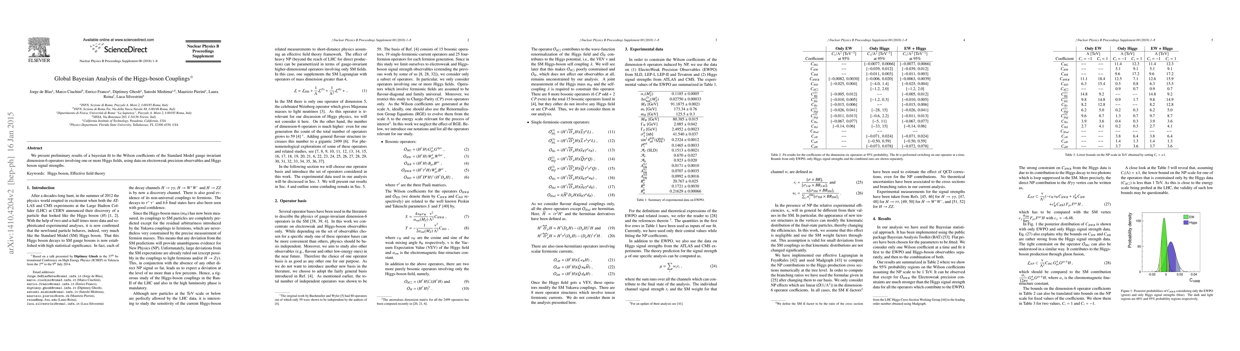 This paper conducts a global Bayesian analysis to determine the Wilson coefficients of dimension-6 operators in the Standard Model, utilizing electroweak precision data and Higgs boson signal strengths to assess Higgs-boson couplings. Preliminary results from this fit are presented.