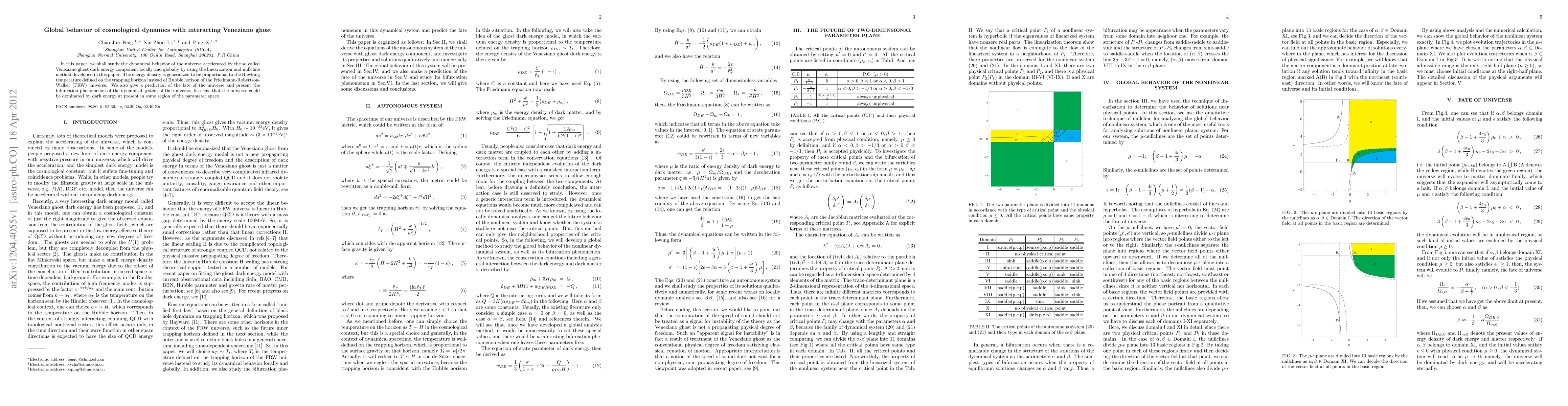 In this paper, we shall study the dynamical behavior of the universe accelerated by the so called Veneziano ghost dark energy component locally and globally by using the linearization and nullcline method developed in this paper. The energy density is generalized to be proportional to the Hawking temperature defined on the trapping horizon instead of Hubble horizon of the Friedmann-Robertson-Walker (FRW) universe. We also give a prediction of the fate of the universe and present the bifurcation phenomenon of the dynamical system of the universe. It seems that the universe could be dominated by dark energy at present in some region of the parameter space.