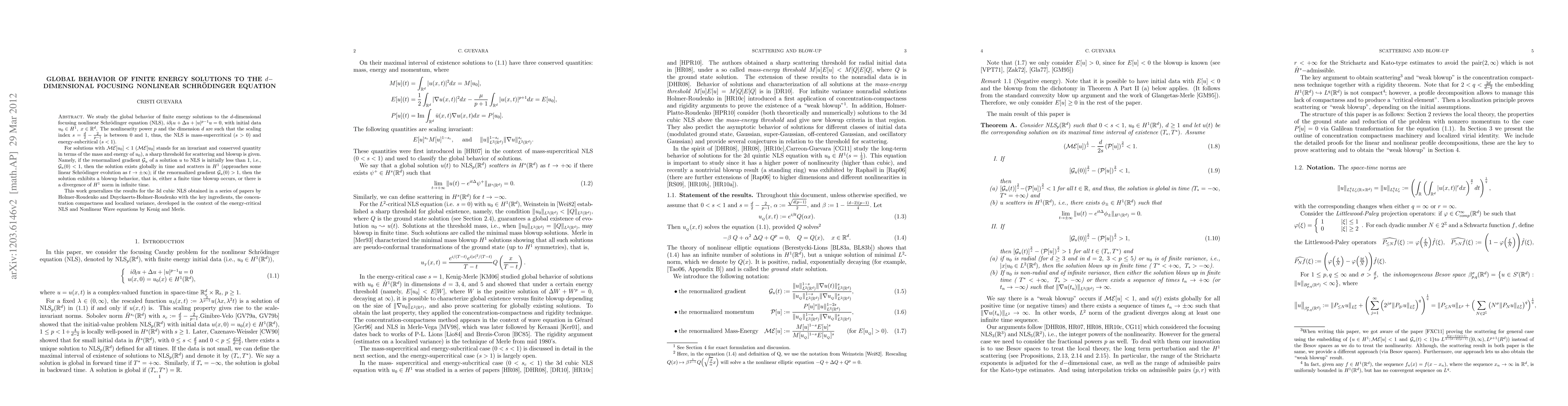 This research paper studies the global behavior of finite energy solutions to the d-dimensional focusing nonlinear Schr"odinger equation, finding that solutions with a certain initial gradient value either scatter or blow up in time.