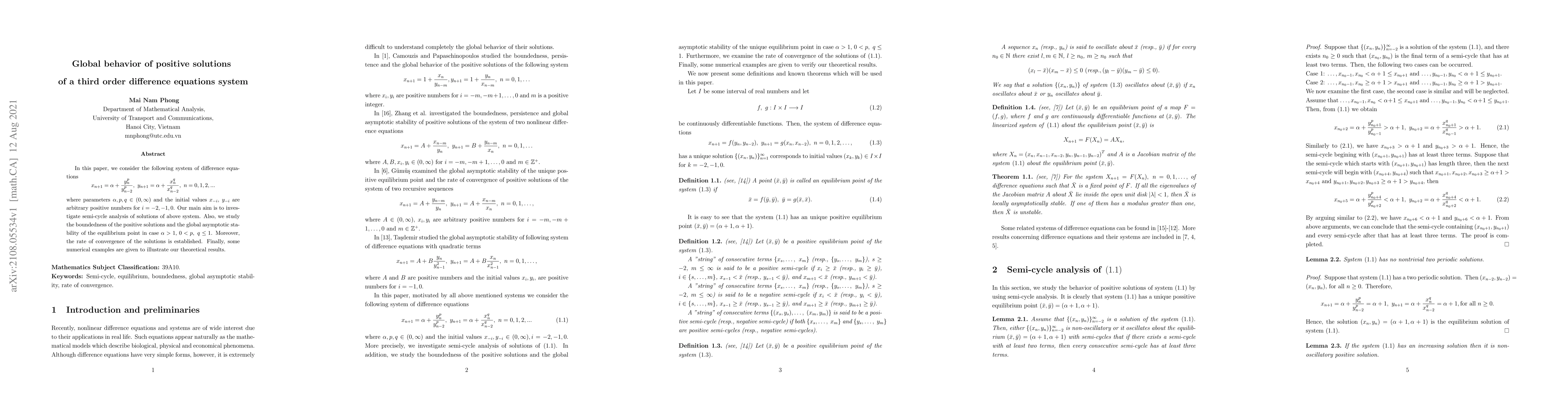 \begin{abstract} In this paper, we consider the following system of difference equations \begin{equation*} x_{n+1}=\alpha+\dfrac{y_{n}^p}{y_{n-2}^p},\ y_{n+1}=\alpha+ \dfrac{x_{n}^q}{x_{n-2}^q}, \ n=0, 1, 2, ... \end{equation*} where parameters $\alpha, p, q \in (0, \infty)$ and the initial values $x_{-i}$, $y_{-i}$ are arbitrary positive numbers for $ i=-2,-1, 0$. Our main aim is to investigate semi-cycle analysis of solutions of above system. Also, we study the boundedness of the positive solutions and the global asymptotic stability of the equilibrium point in case $\alpha>1$, $ 0