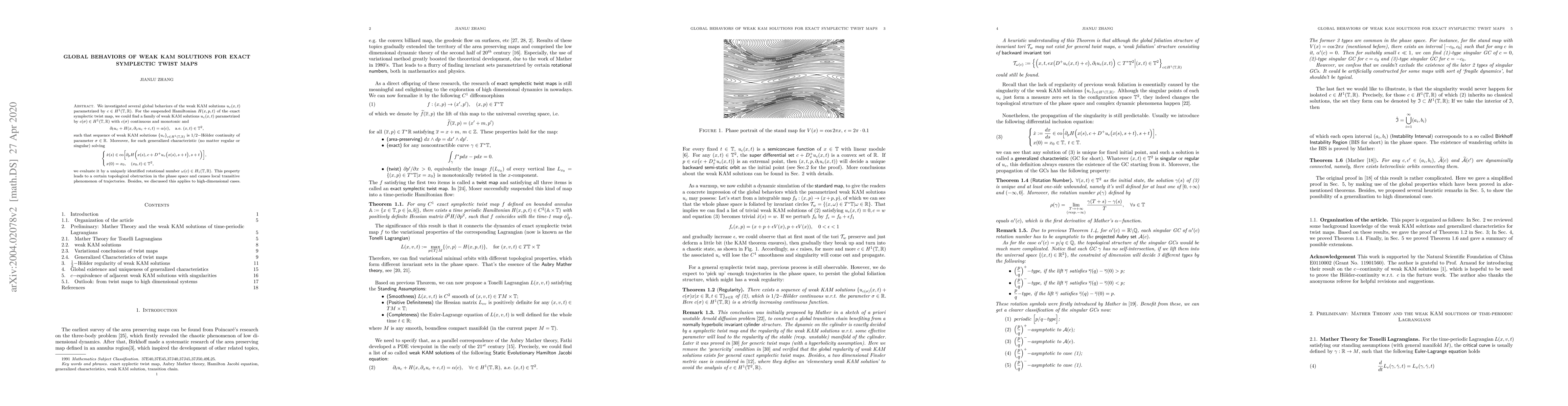We investigated several global behaviors of the weak KAM solutions $u_c(x,t)$ parametrized by $c\in H^1(\mathbb T,\mathbb R)$. For the suspended Hamiltonian $H(x,p,t)$ of the exact symplectic twist map, we could find a family of weak KAM solutions $u_c(x,t)$ parametrized by $c(\sigma)\in H^1(\mathbb T,\mathbb R)$ with $c(\sigma)$ continuous and monotonic and \[ \partial_tu_c+H(x,\partial_x u_c+c,t)=\alpha(c),\quad \text{a.e.\ } (x,t)\in\mathbb T^2, \] such that sequence of weak KAM solutions $\{u_c\}_{c\in H^1(\mathbb T,\mathbb R)}$ is $1/2-$H\"older continuity of parameter $\sigma\in \mathbb{R}$. Moreover, for each generalized characteristic (no matter regular or singular) solving \[ \left\{ \begin{aligned} &\dot{x}(s)\in \text{co} \Big[\partial_pH\Big(x(s),c+D^+u_c\big(x(s),s+t\big),s+t\Big)\Big], & \\ &x(0)=x_0,\quad (x_0,t)\in\mathbb T^2,& \end{aligned} \right. \] we evaluate it by a uniquely identified rotational number $\omega(c)\in H_1(\mathbb T,\mathbb R)$. This property leads to a certain topological obstruction in the phase space and causes local transitive phenomenon of trajectories. Besides, we discussed this applies to high-dimensional cases.