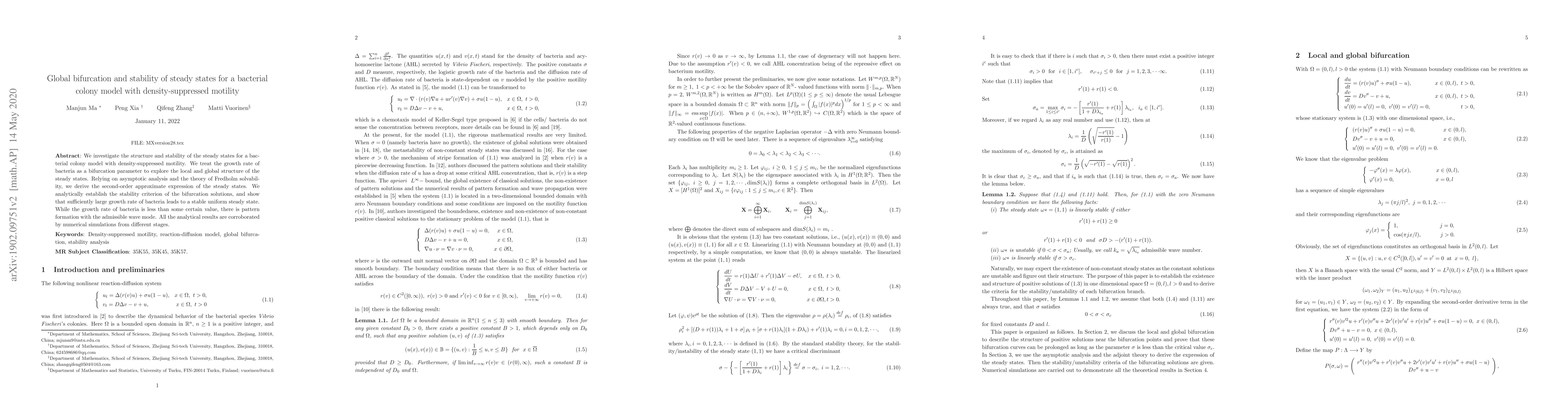 This paper examines the steady states and their stability in a bacterial colony model where motility is suppressed by density. By treating the growth rate as a bifurcation parameter, the authors derive second-order approximations and establish stability criteria, showing that high growth rates lead to stable uniform states, while lower rates result in pattern formation. Analytical findings are validated through numerical simulations.