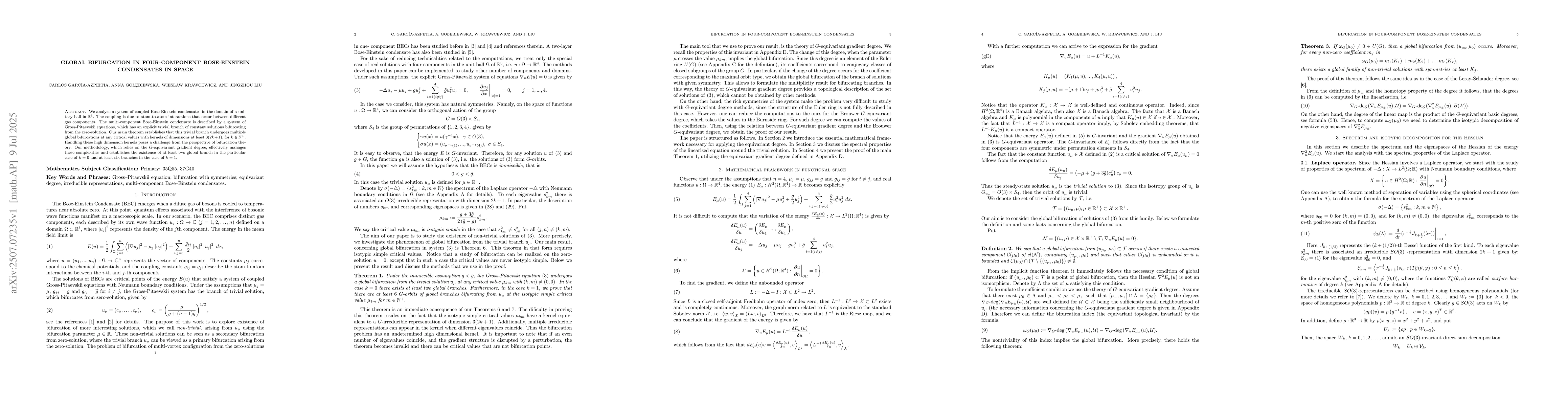 The research employs bifurcation theory, specifically the $G$-equivariant gradient degree, to analyze a system of coupled Bose-Einstein condensates in a unitary ball in $\mathbb{R}^3$. The system is described by Gross-Pitaevskii equations, and the study focuses on the trivial branch of constant solutions bifurcating from the zero-solution.