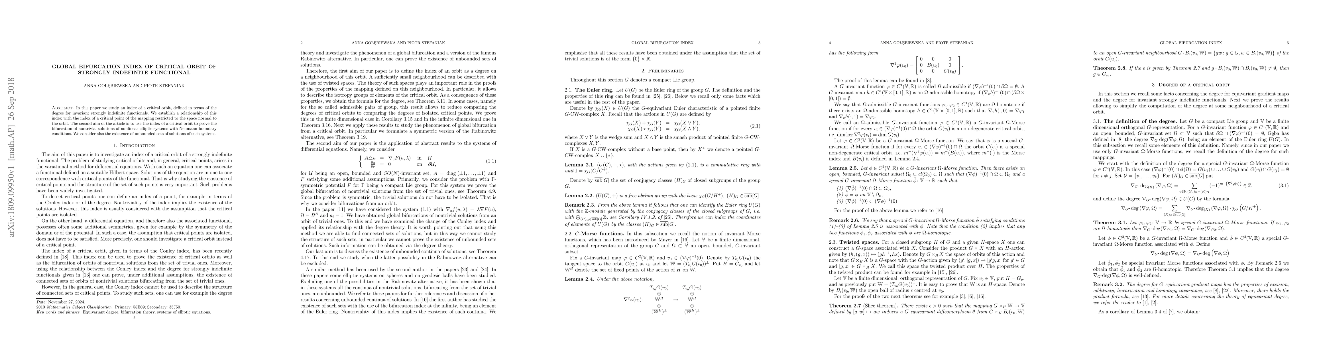 In this paper we study an index of a critical orbit, defined in terms of the degree for invariant strongly indefinite functionals. We establish a relationship of this index with the index of a critical point of the mapping restricted to the space normal to the orbit. The second aim of the article is to use the index of a critical orbit to prove the bifurcation of nontrivial solutions of nonlinear elliptic systems with Neumann boundary conditions. We consider also the existence of unbounded sets of solutions of such systems.