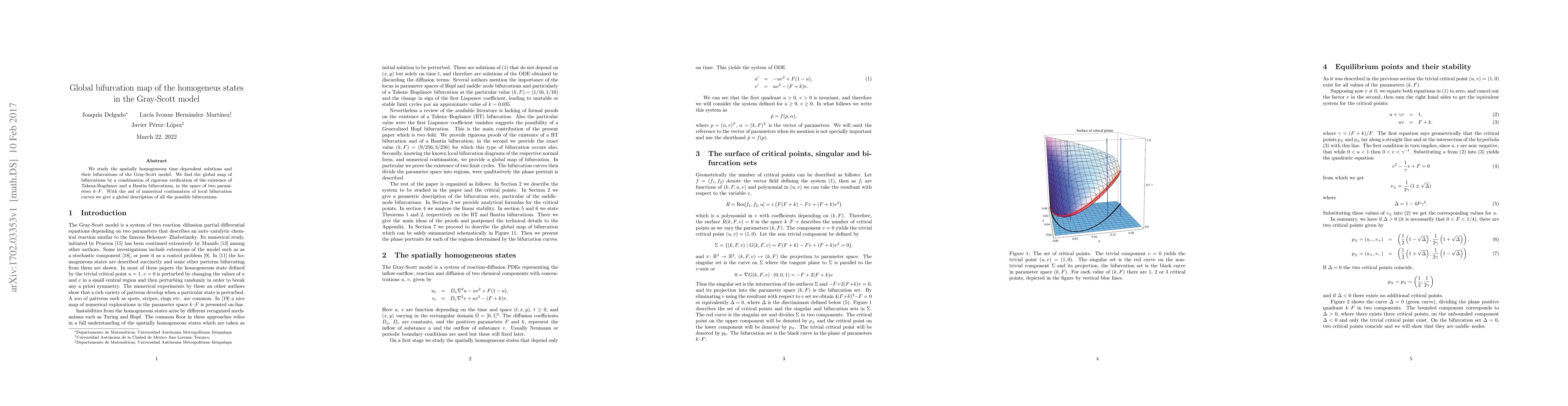 We study the spatially homogeneous time dependent solutions and their bifurcations of the Gray-Scott model. We find the global map of bifurcations by a combination of rigorous verification of the existence of Takens Bogdanov and a Bautin bifurcations, in the space of two parameters k and F. With the aid of numerical continuation of local bifurcation curves we give a global description of all the possible bifurcations