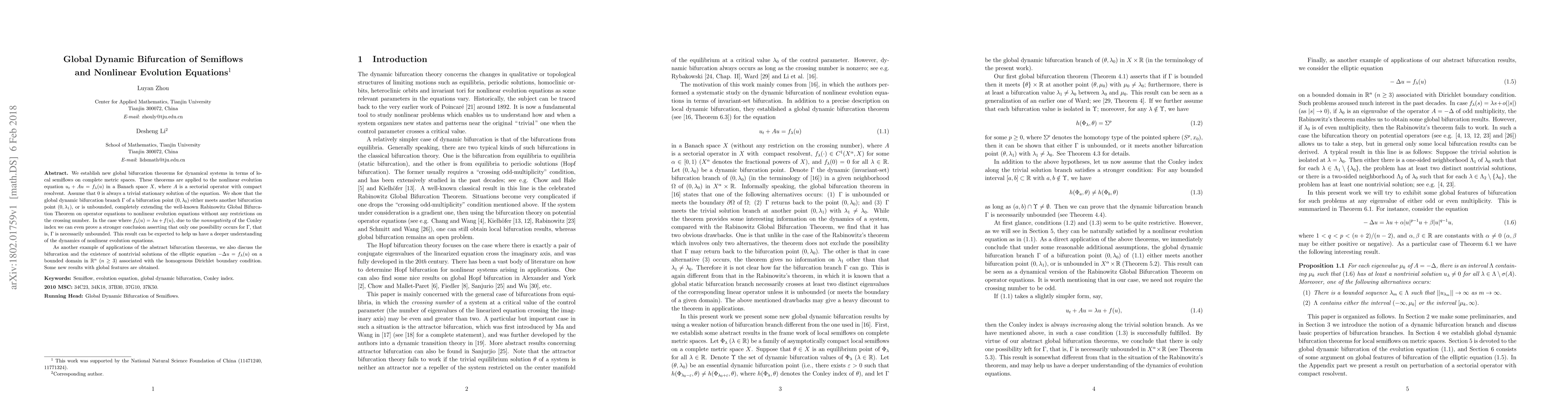 This paper establishes new global bifurcation theorems for dynamical systems and applies them to nonlinear evolution equations, showing that bifurcation branches are either unbounded or meet another bifurcation point. It extends the Rabinowitz Global Bifurcation Theorem, proving that for specific forms of $f_\lambda(u)$, the bifurcation branch must be unbounded, aiding in understanding the dynamics of nonlinear evolution equations.