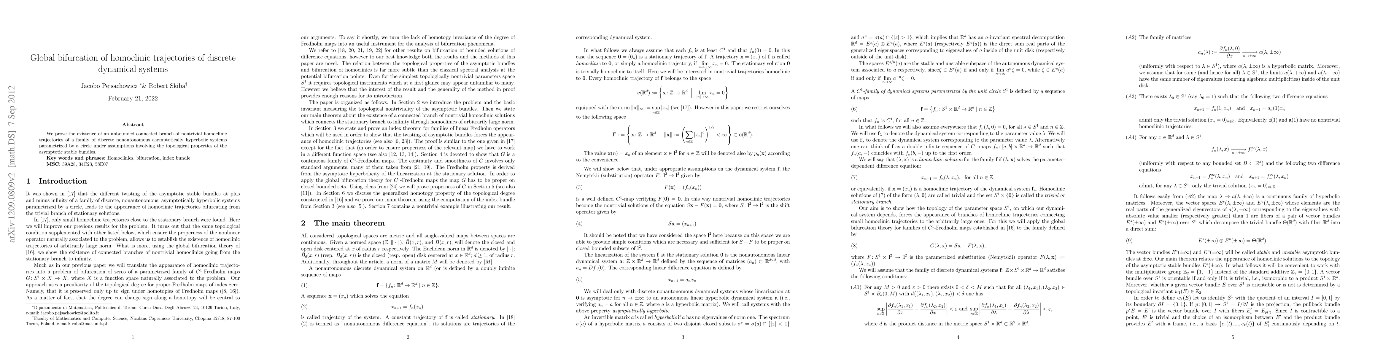 Summary: The paper proves the existence of an unbounded connected branch of nontrivial homoclinic trajectories in a family of discrete nonautonomous asymptotically hyperbolic systems, under conditions related to the topological properties of the asymptotic stable bundles. This establishes a global bifurcation phenomenon.