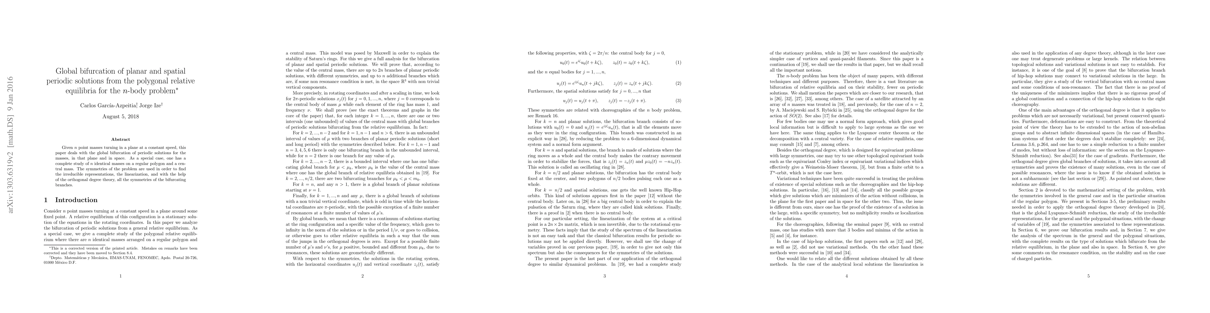 Given $n$ point masses turning in a plane at a constant speed, this paper deals with the global bifurcation of periodic solutions for the masses, in that plane and in space. As a special case, one has a complete study of n identical masses on a regular polygon and a central mass. The symmetries of the problem are used in order to find the irreducible representations, the linearization, and with the help of the orthogonal degree theory, all the symmetries of the bifurcating branches.