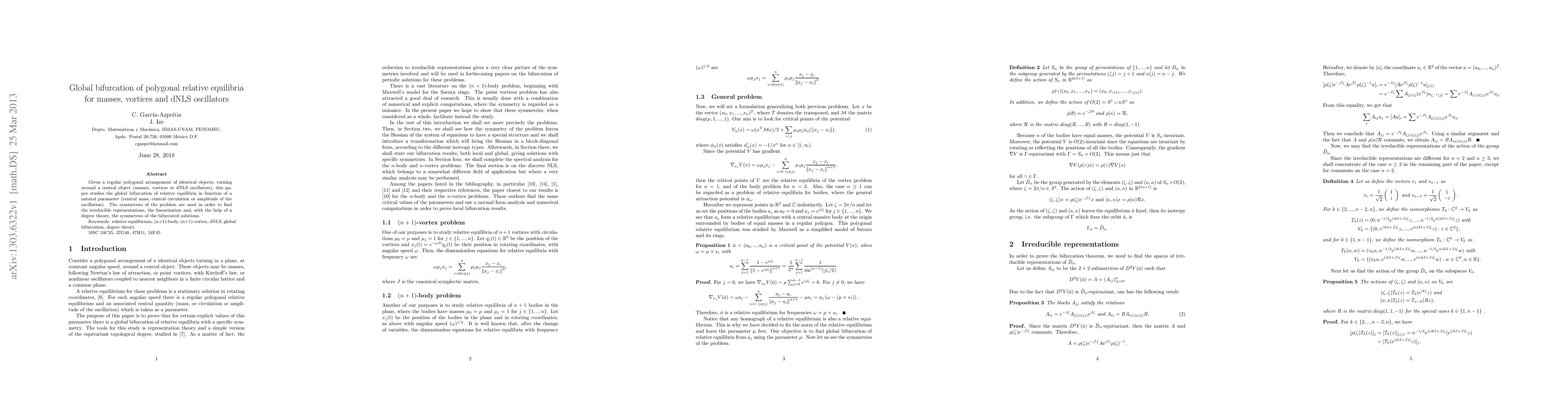 Given a regular polygonal arrangement of identical objects, turning around a central object (masses, vortices or dNLS oscillators), this paper studies the global bifurcation of relative equilibria in function of a natural parameter (central mass, central circulation or amplitude of the oscillation). The symmetries of the problem are used in order to find the irreducible representations, the linearization and, with the help of a degree theory, the symmetries of the bifurcated solutions.