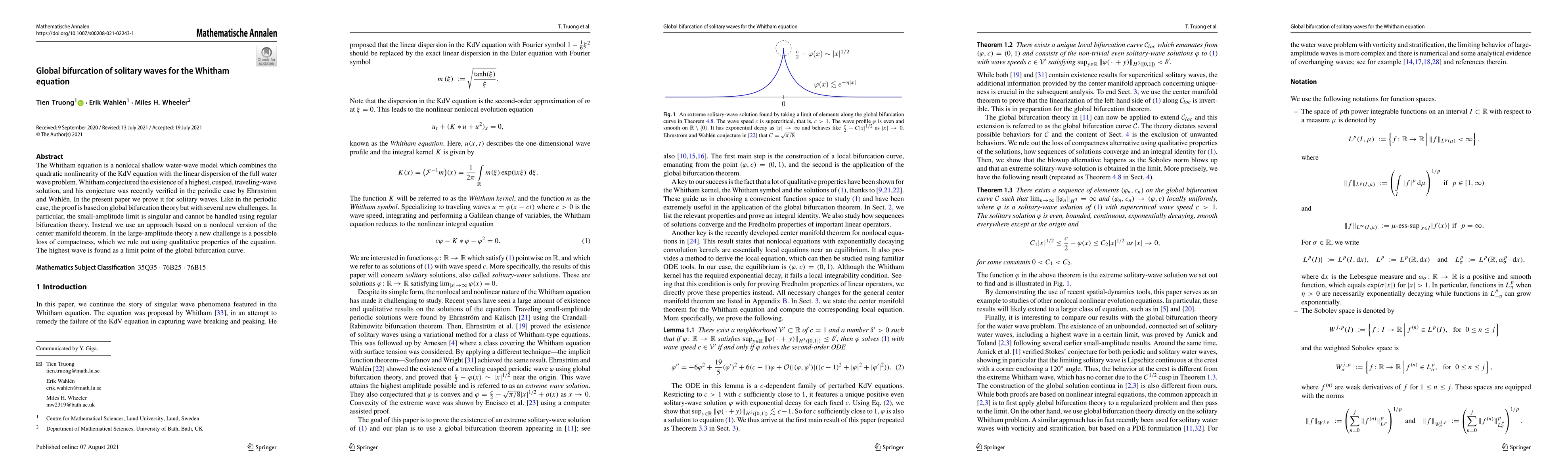 The research is important because it verifies Whitham's conjecture and provides insight into global bifurcation theory for solitary waves.