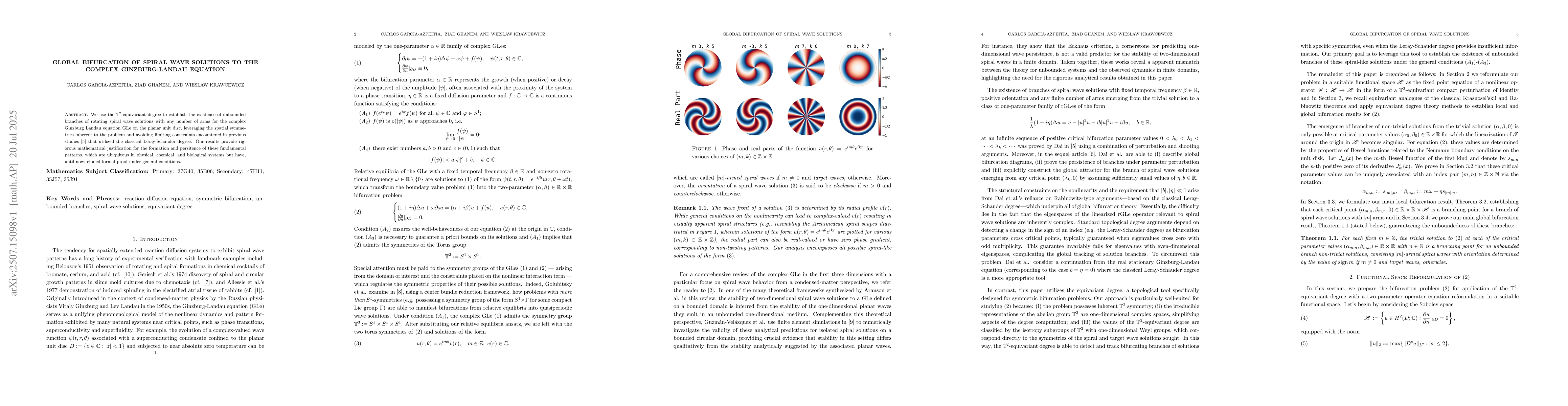 The research employs the $\mathbb T^2$-equivariant degree to establish the existence of unbounded branches of rotating spiral wave solutions for the complex Ginzburg-Landau equation (GLe) on the planar unit disc, utilizing spatial symmetries and avoiding previous limiting constraints.
