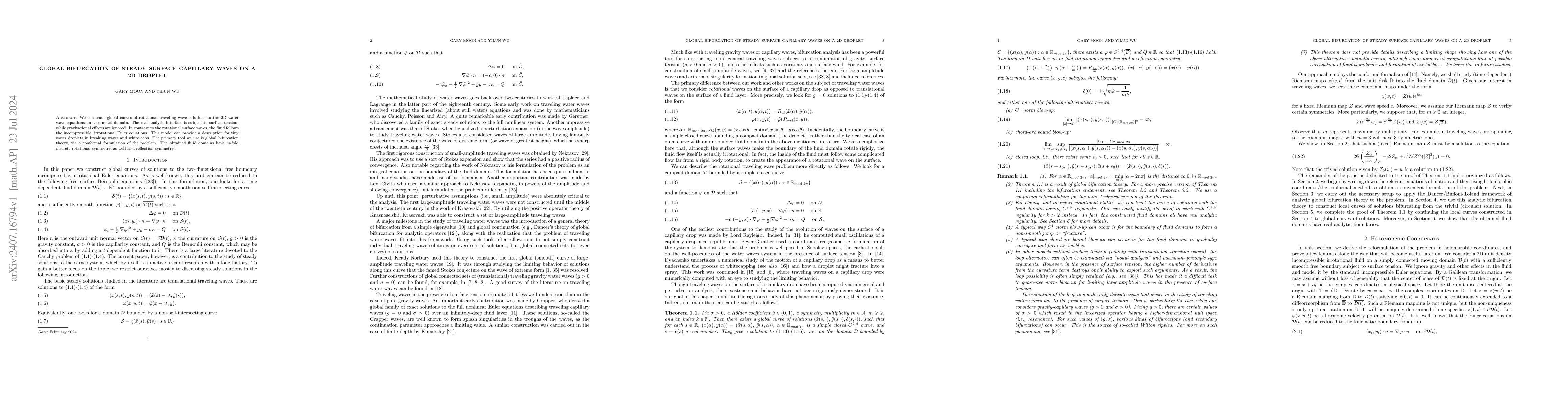 This paper utilizes global bifurcation theory to derive rotational traveling wave solutions for steady surface capillary waves on a 2D droplet, ignoring gravity and focusing on surface tension. The study highlights the fluid domains' rotational and reflection symmetries, providing insights into tiny water droplets in breaking waves and white caps.