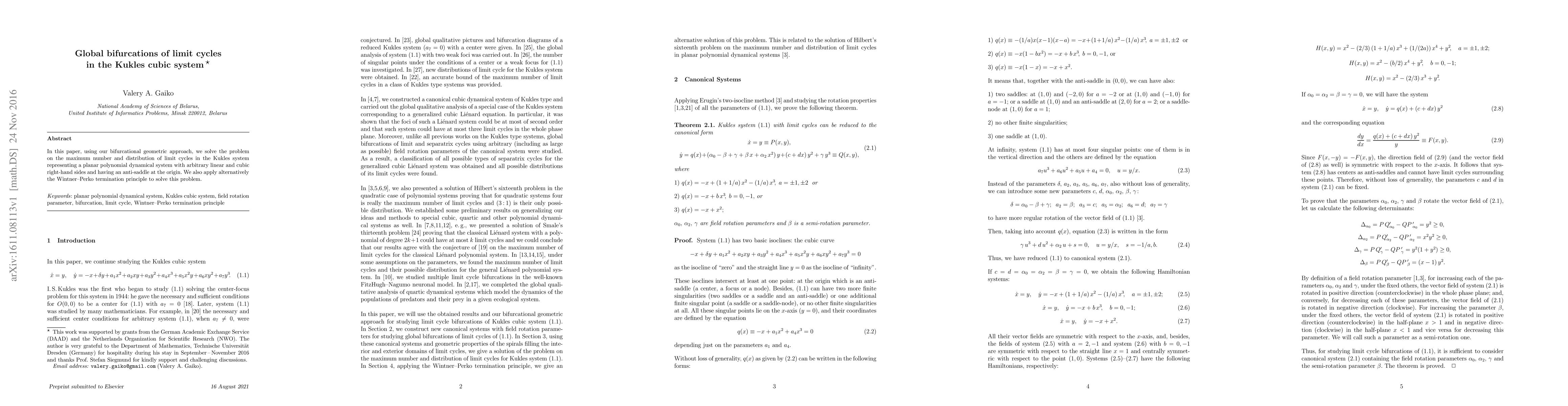 This paper determines the maximum number and distribution of limit cycles in the Kukles cubic system using a bifurcational geometric approach and the Wintner-Perko termination principle, revealing the dynamical behavior of the system around its anti-saddle point.