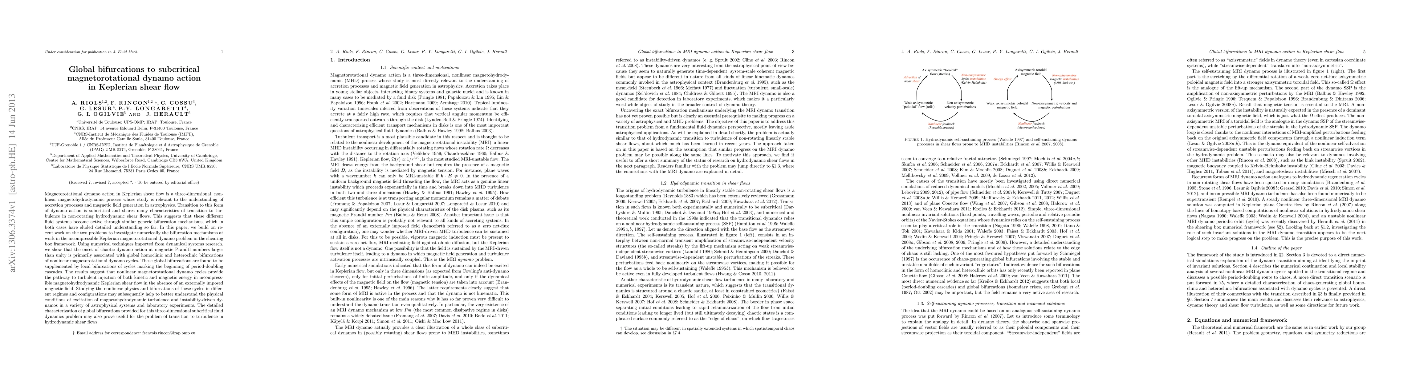 This paper investigates the bifurcation mechanisms behind subcritical magnetorotational dynamo action in Keplerian shear flow, revealing that global homoclinic and heteroclinic bifurcations, along with local period-doubling cascades, drive the onset of chaotic dynamo behavior. These findings suggest a pathway to turbulent energy injection in magnetohydrodynamic systems and may aid in understanding turbulence in hydrodynamic shear flows.