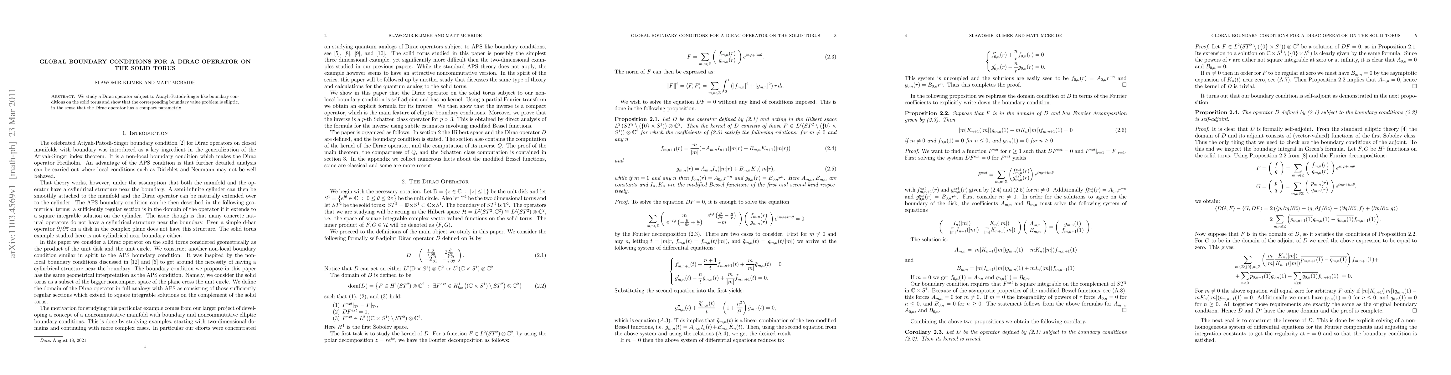 Summary: The paper investigates a Dirac operator on the solid torus with Atiyah-Patodi-Singer boundary conditions, proving the ellipticity of the boundary value problem through the existence of a compact parametrix.