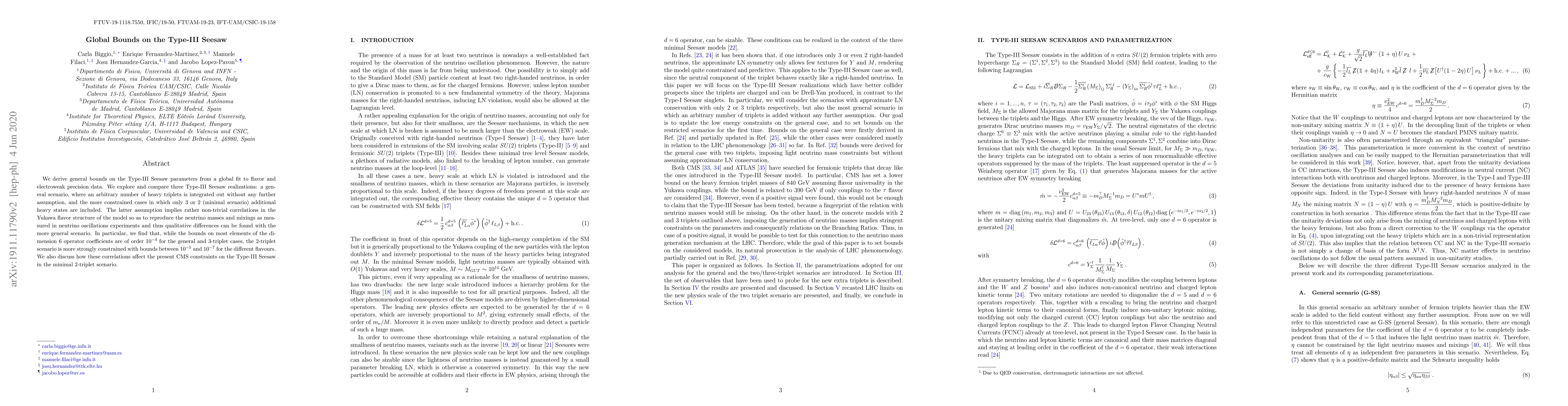 This research derives global bounds on Type-III Seesaw parameters using flavor and electroweak precision data. It compares three Type-III Seesaw models, finding that a minimal 2-triplet scenario has stricter constraints (10^-5 to 10^-7) on dimension 6 operator coefficients compared to the general and 3-triplet cases (10^-4). The study also examines the impact of these correlations on current CMS constraints within the minimal 2-triplet scenario.