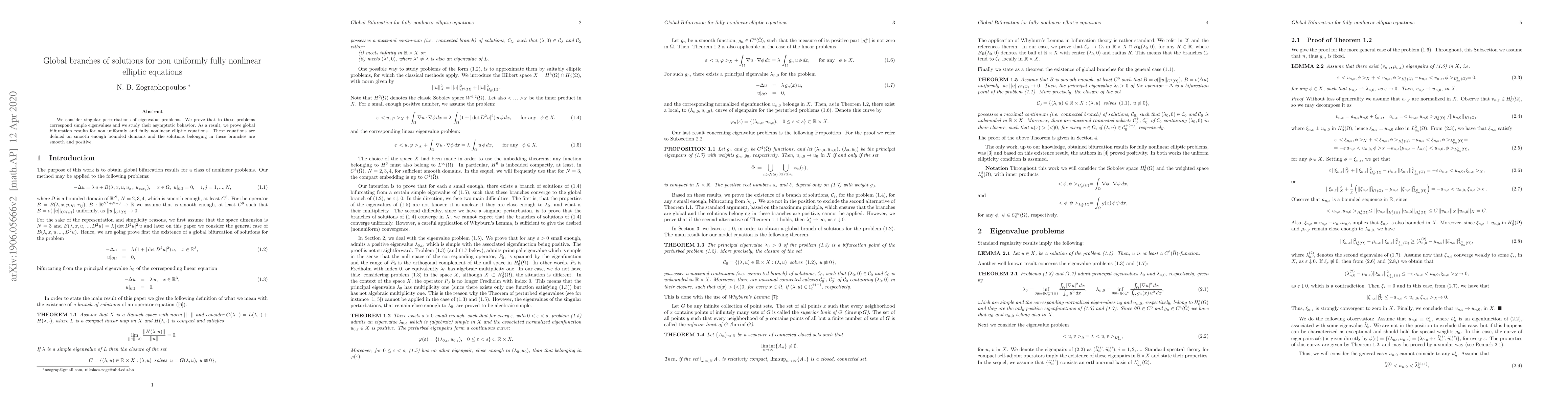 We consider singular perturbations of eigenvalue problems. We prove that to these problems correspond simple eigenvalues and we study their asymptotic behavior. As a result, we prove global bifurcation results for non uniformly and fully nonlinear elliptic equations. These equations are defined on smooth enough bounded domains and the solutions belonging in these branches are smooth and positive.