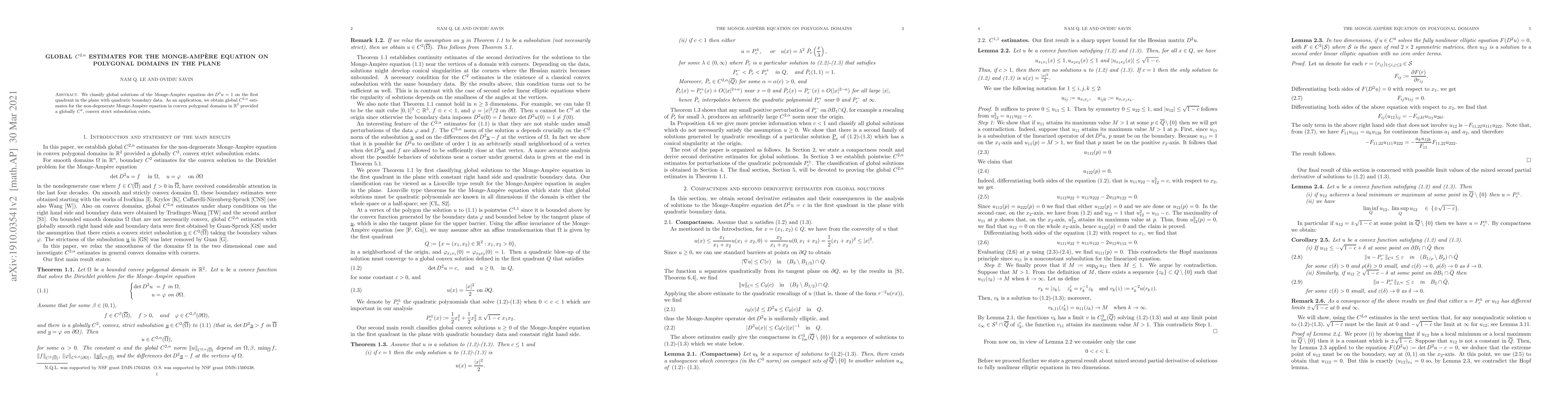 We classify global solutions of the Monge-Amp\`ere equation $\det D^2 u=1 $ on the first quadrant in the plane with quadratic boundary data. As an application, we obtain global $C^{2,\alpha}$ estimates for the non-degenerate Monge-Amp\`ere equation in convex polygonal domains in $\mathbb R^2$ provided a globally $C^2$, convex strict subsolution exists.