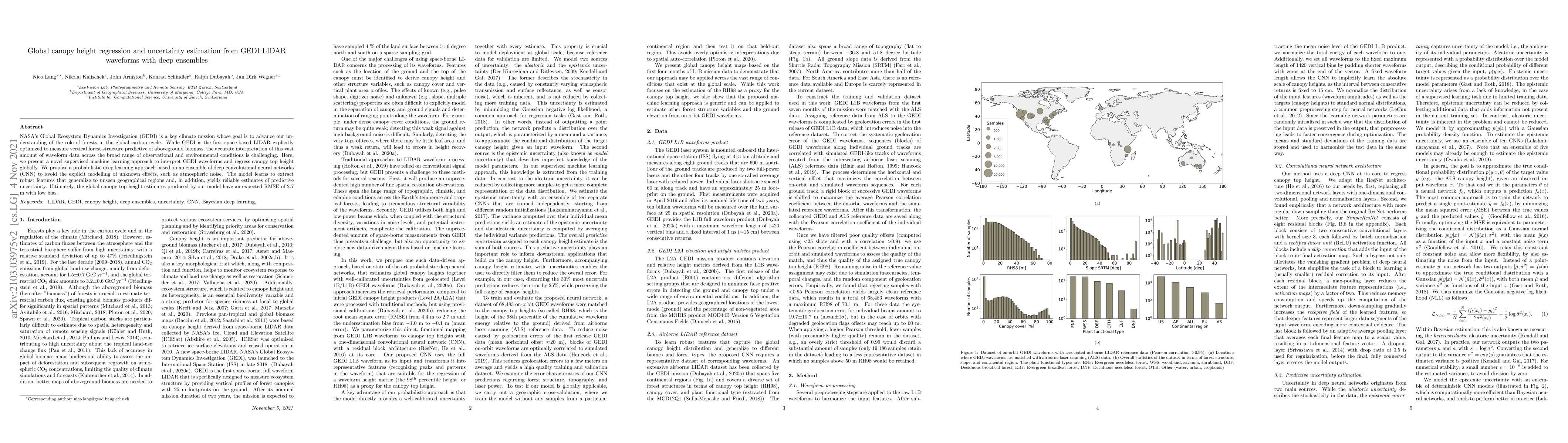 This paper introduces a deep learning ensemble approach to regress global canopy height from GEDI LIDAR waveforms, achieving an RMSE of 2.7 m with low bias. The probabilistic model estimates predictive uncertainty and generalizes to diverse environmental conditions.