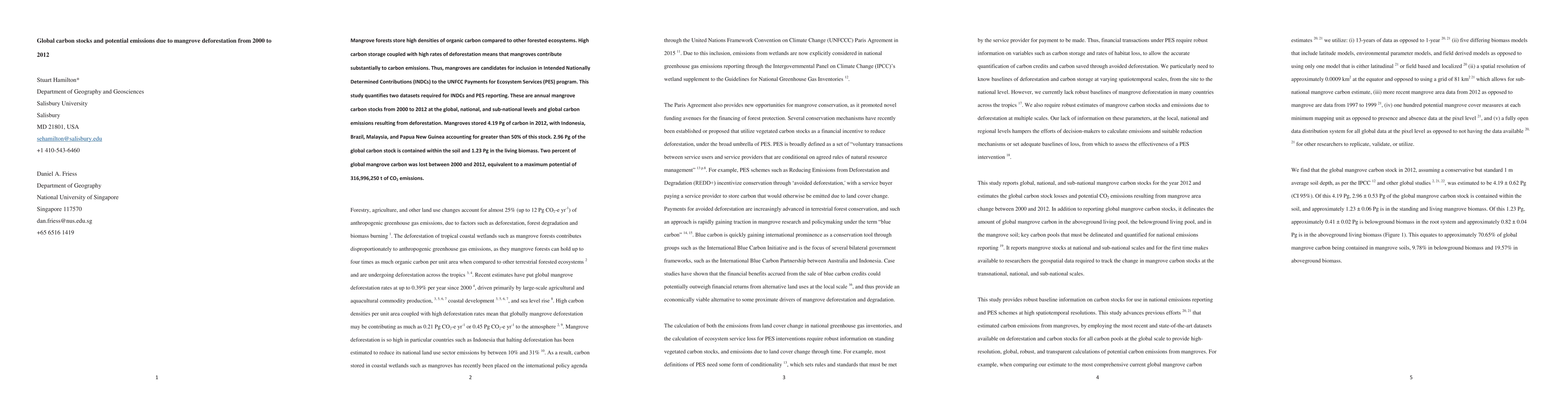 Mangrove forests store high densities of organic carbon compared to other forested ecosystems. High carbon storage coupled with high rates of deforestation means that mangroves contribute substantially to carbon emissions. Thus, mangroves are candidates for inclusion in Intended Nationally Determined Contributions (INDCs) to the UNFCC Payments for Ecosystem Services (PES) program. This study quantifies two datasets required for INDCs and PES reporting. These are annual mangrove carbon stocks from 2000 to 2012 at the global, national, and sub-national levels and global carbon emissions resulting from deforestation. Mangroves stored 4.19 Pg of carbon in 2012, with Indonesia, Brazil, Malaysia, and Papua New Guinea accounting for greater than 50% of this stock. 2.96 Pg of the global carbon stock is contained within the soil and 1.23 Pg in the living biomass. Two percent of global mangrove carbon was lost between 2000 and 2012, equivalent to a maximum potential of 316,996,250 t of CO2 emissions.