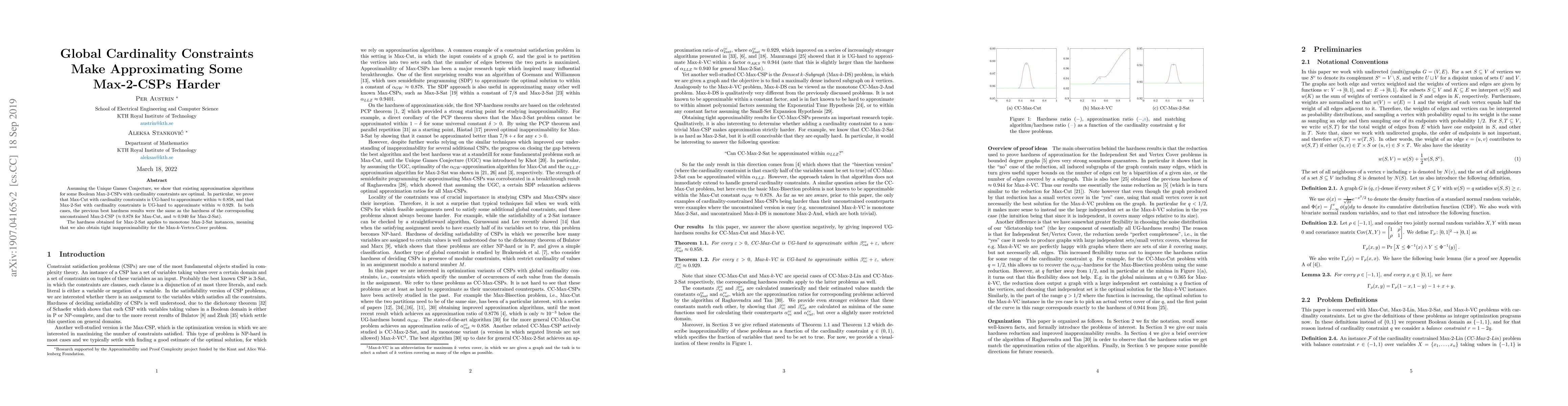 This paper demonstrates that under the Unique Games Conjecture, certain Boolean Max-2-CSPs with cardinality constraints cannot be approximated better than previously thought, showing optimal hardness for Max-Cut and Max-2-Sat. The new results achieve tighter approximation bounds of 0.858 for Max-Cut and 0.929 for Max-2-Sat.