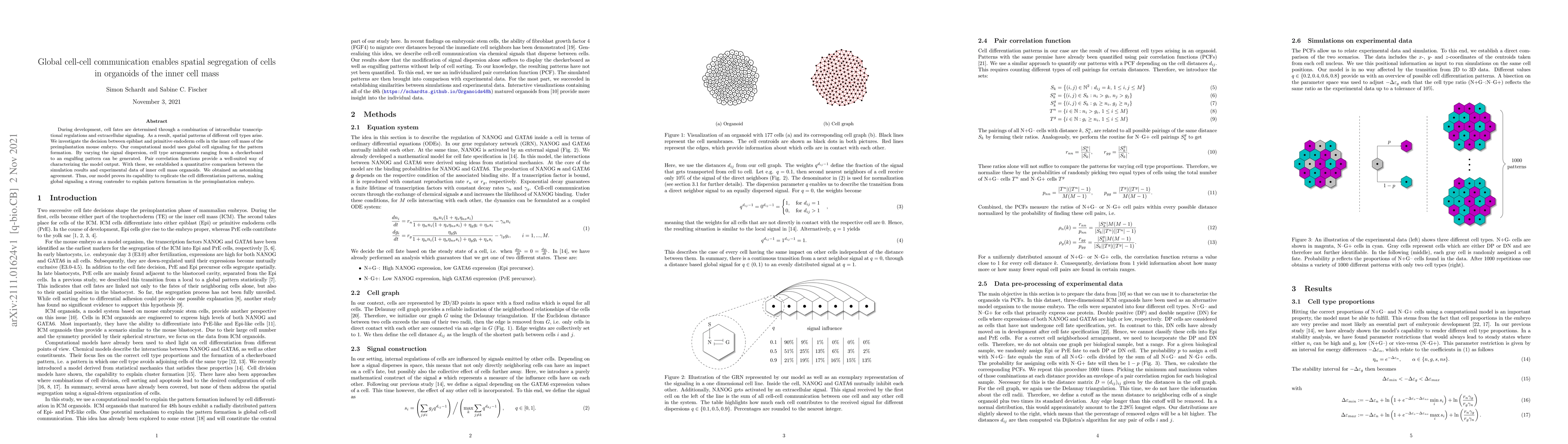 This research investigates how global cell-cell communication influences the spatial segregation of epiblast and primitive endoderm cells in mouse embryo organoids. The study's computational model demonstrates that varying signal dispersion can generate diverse cell type arrangements, and it successfully replicates observed differentiation patterns, highlighting the role of global signaling in pattern formation.