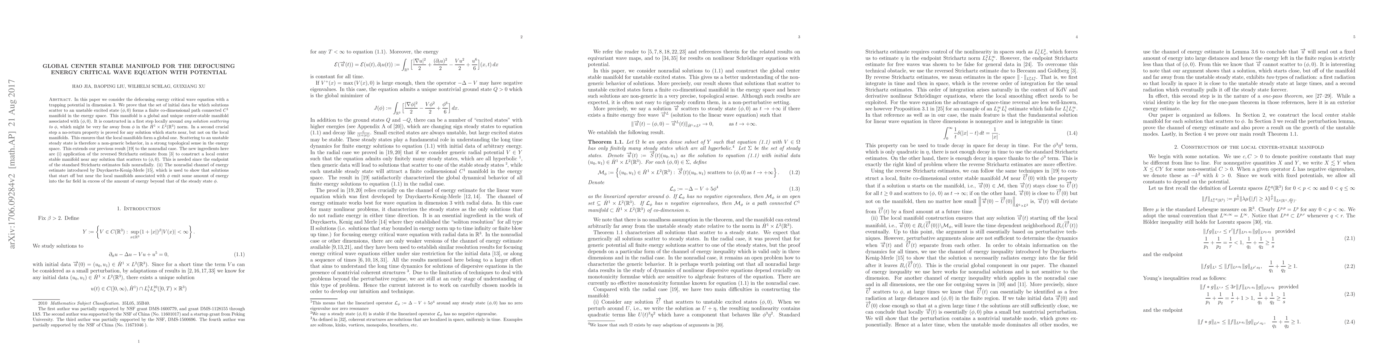 This paper proves the existence of a global center stable manifold in the energy space for the defocusing energy critical wave equation with a trapping potential in dimension 3. It demonstrates that scattering to an unstable excited state is non-generic, using reversed Strichartz estimates and a nonradial channel of energy estimate.