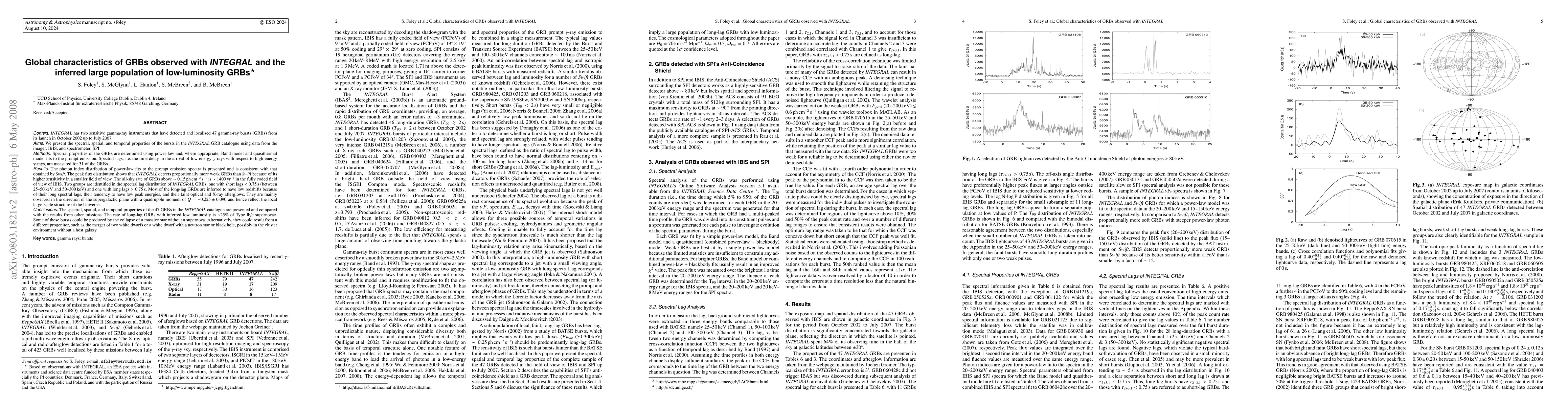 INTEGRAL has two sensitive gamma-ray instruments that have detected 46 gamma-ray bursts (GRBs) up to July 2007. We present the spectral, spatial, and temporal properties of the bursts in the INTEGRAL GRB catalogue using data from the imager, IBIS, and spectrometer, SPI. Spectral properties of the GRBs are determined using power-law, Band model and quasithermal model fits to the prompt emission. Spectral lags, i.e. the time delay in the arrival of low-energy gamma-rays with respect to high-energy gamma-rays, are measured for 31 of the GRBs. The photon index distribution of power-law fits to the prompt emission spectra is consistent with that obtained by Swift. The peak flux distribution shows that INTEGRAL detects proportionally more weak GRBs than Swift because of its higher sensitivity in a smaller field of view. The all-sky rate of GRBs above ~0.15 ph cm^-2 s^-1 is ~1400 yr^-1 in the fully coded field of view of IBIS. Two groups are identified in the spectral lag distribution, one with short lags <0.75 s (between 25-50 keV and 50-300 keV) and one with long lags >0.75 s. Most of the long-lag GRBs are inferred to have low redshifts because of their long spectral lags, their tendency to have low peak energies and their faint optical and X-ray afterglows. They are mainly observed in the direction of the supergalactic plane with a quadrupole moment of Q=-0.225+/-0.090 and hence reflect the local large-scale structure of the Universe. The rate of long-lag GRBs with inferred low luminosity is ~25% of Type Ib/c supernovae. Some of these bursts could be produced by the collapse of a massive star without a supernova or by a different progenitor, such as the merger of two white dwarfs or a white dwarf with a neutron star or black hole, possibly in the cluster environment without a host galaxy.