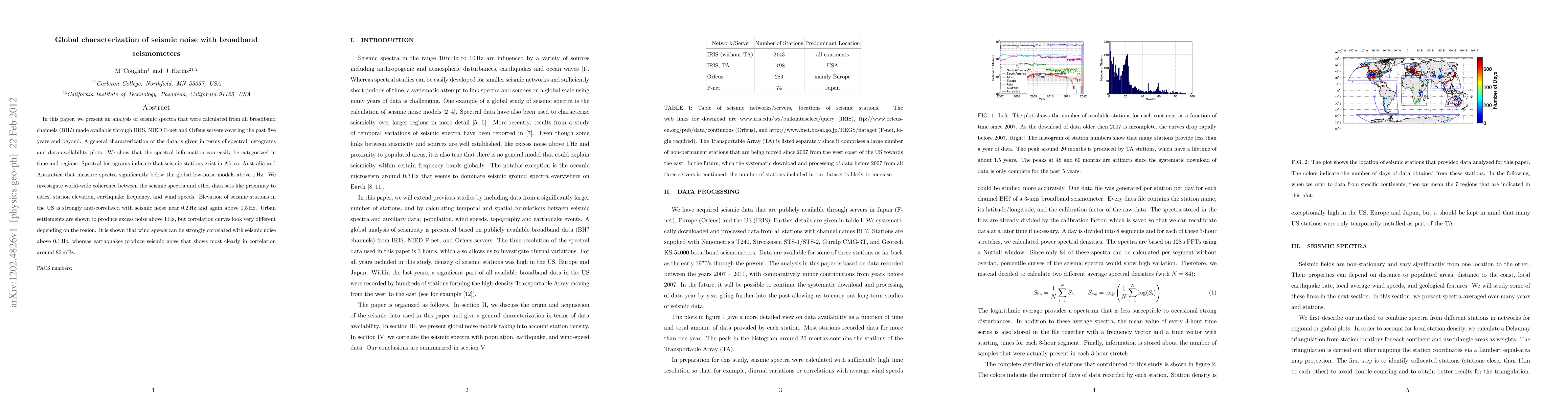 In this paper, we present an analysis of seismic spectra that were calculated from all broadband channels (BH?) made available through IRIS, NIED F-net and Orfeus servers covering the past five years and beyond. A general characterization of the data is given in terms of spectral histograms and data-availability plots. We show that the spectral information can easily be categorized in time and regions. Spectral histograms indicate that seismic stations exist in Africa, Australia and Antarctica that measure spectra significantly below the global low-noise models above 1 Hz. We investigate world-wide coherence between the seismic spectra and other data sets like proximity to cities, station elevation, earthquake frequency, and wind speeds. Elevation of seismic stations in the US is strongly anti-correlated with seismic noise near 0.2 Hz and again above 1.5 Hz. Urban settlements are shown to produce excess noise above 1 Hz, but correlation curves look very different depending on the region. It is shown that wind speeds can be strongly correlated with seismic noise above 0.1 Hz, whereas earthquakes produce seismic noise that shows most clearly in correlation around 80 mHz.