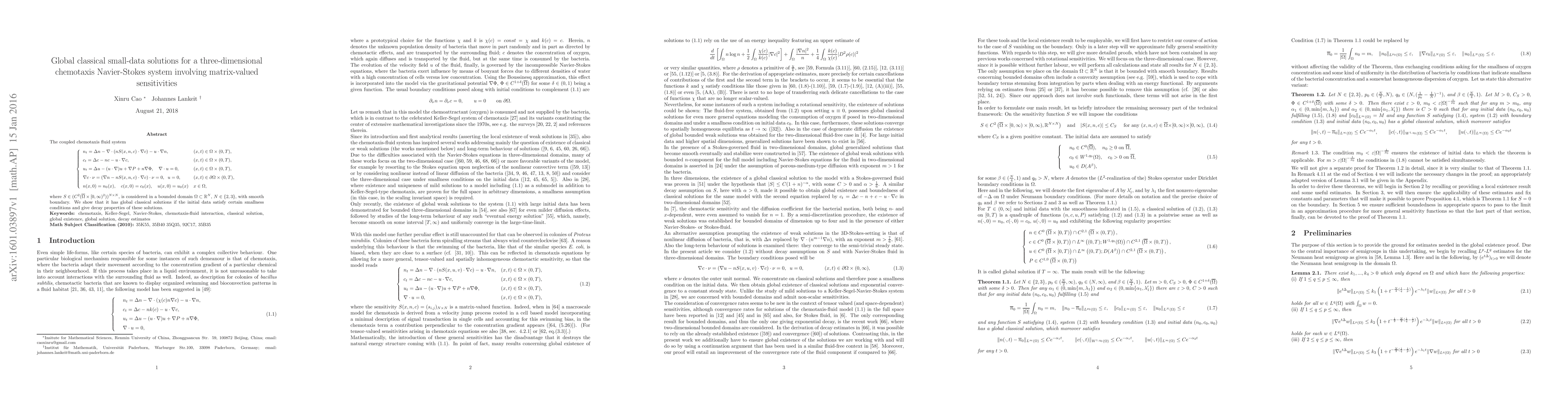 The coupled chemotaxis fluid system \begin{equation} \left\{ \begin{array}{llc} n_t=\Delta n-\nabla\cdot(n S(x,n,c)\cdot\nabla c)-u\cdot\nabla n, &(x,t)\in \Omega\times (0,T), \displaystyle c_t=\Delta c-nc-u\cdot\nabla c, &(x,t)\in\Omega\times (0,T), \displaystyle u_t=\Delta u-(u\cdot\nabla )u+\nabla P+n\nabla\Phi,\quad \nabla\cdot u=0, &(x,t)\in\Omega\times (0,T), \displaystyle \nabla c\cdot\nu=(\nabla n-nS(x,n,c)\cdot\nabla c)\cdot\nu=0, \;\; u=0,&(x,t)\in \partial\Omega\times (0,T), n(x,0)=n_{0}(x),\quad c(x,0)=c_{0}(x),\quad u(x,0)=u_0(x) & x\in\Omega, \end{array} \right. \end{equation} where $S\in (C^2(\bar{\Omega}\times [0,\infty)^2))^{N\times N}$, is considered in a bounded domain $\Omega\subset\mathbb{R}^N$, $N\in\{2,3\}$, with smooth boundary. We show that it has global classical solutions if the initial data satisfy certain smallness conditions and give decay properties of these solutions.