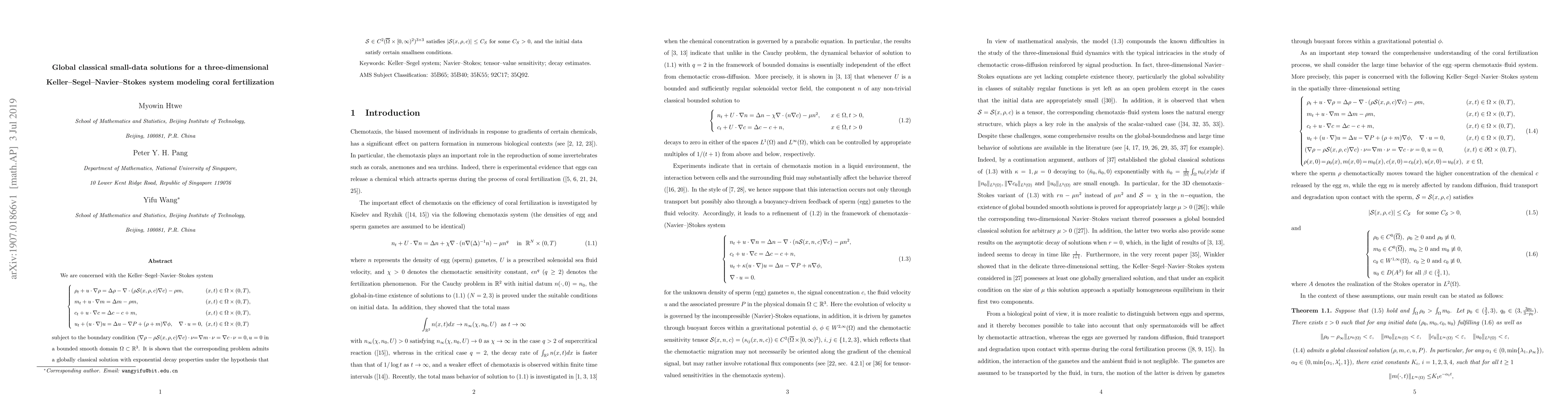 This paper investigates the global classical small-data solutions for a three-dimensional Keller-Segel-Navier-Stokes system modeling coral fertilization. The authors prove the existence of globally classical solutions with exponential decay under the assumption that the system's parameters satisfy certain smallness and boundedness conditions.