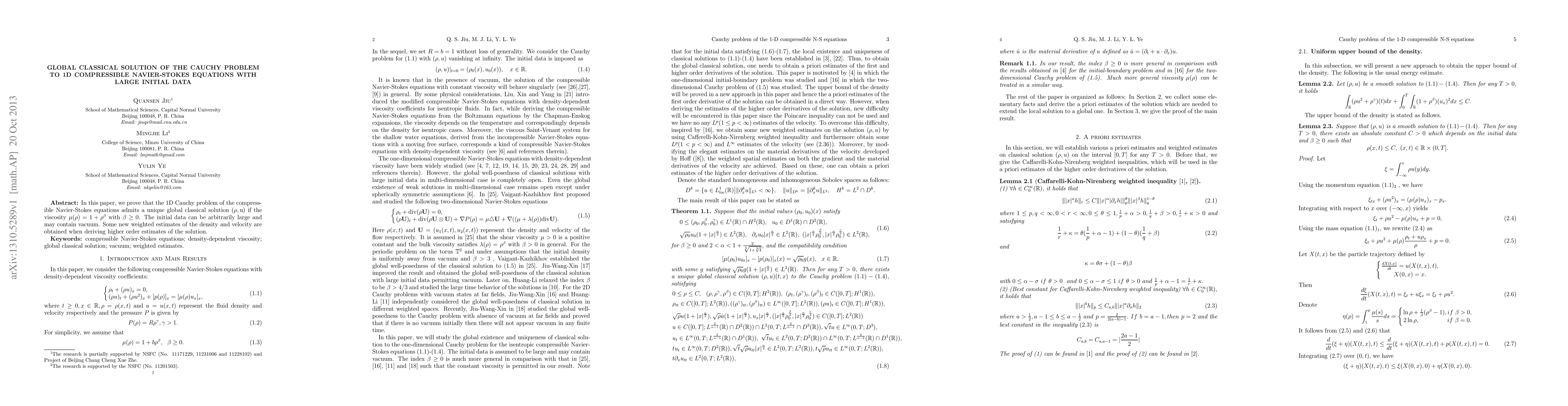 This paper proves the existence of a unique global classical solution for the 1D compressible Navier-Stokes equations with large initial data, including vacuum, under a viscosity condition. New weighted estimates for density and velocity are derived to support higher-order solution estimates.