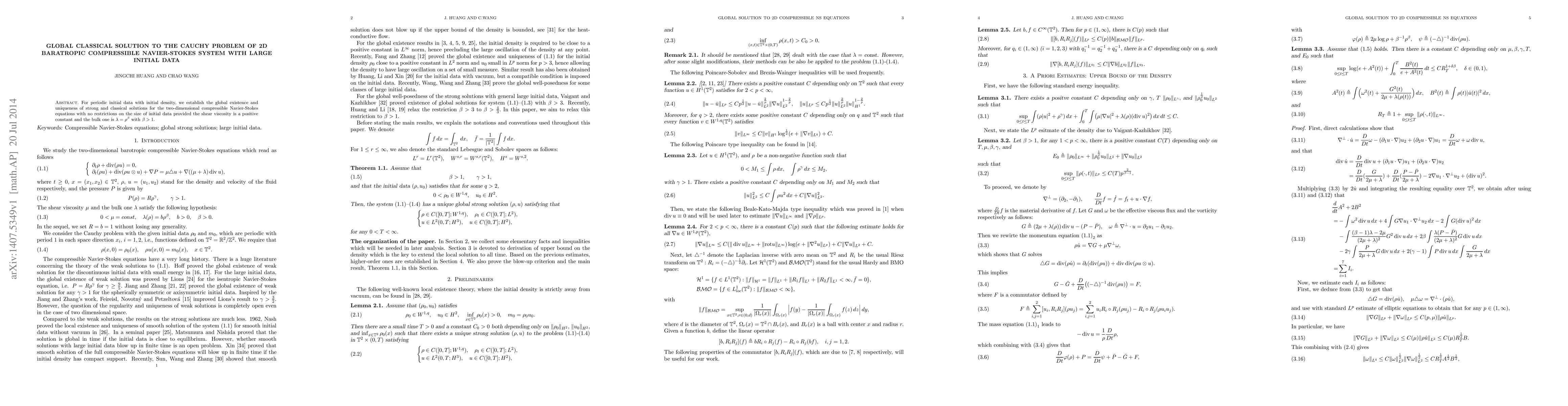 For periodic initial data with initial density, we establish the global existence and uniqueness of strong and classical solutions for the two-dimensional compressible Navier-Stokes equations with no restrictions on the size of initial data provided the shear viscosity is a positive constant and the bulk one is $\lam=\rho^{\b}$ with $\b>1.$