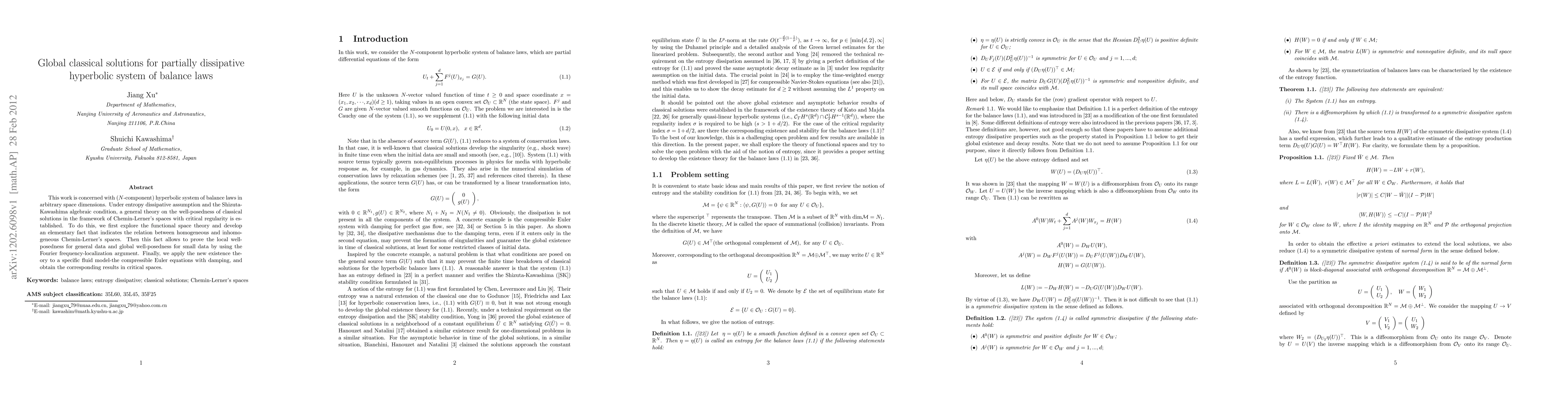 This paper establishes a general theory for the well-posedness of classical solutions to an $N$-component hyperbolic system of balance laws under entropy dissipative assumptions and the Shizuta-Kawashima condition. It leverages Chemin-Lerner spaces and Fourier frequency-localization to prove local and global existence, and applies the theory to the compressible Euler equations with damping.