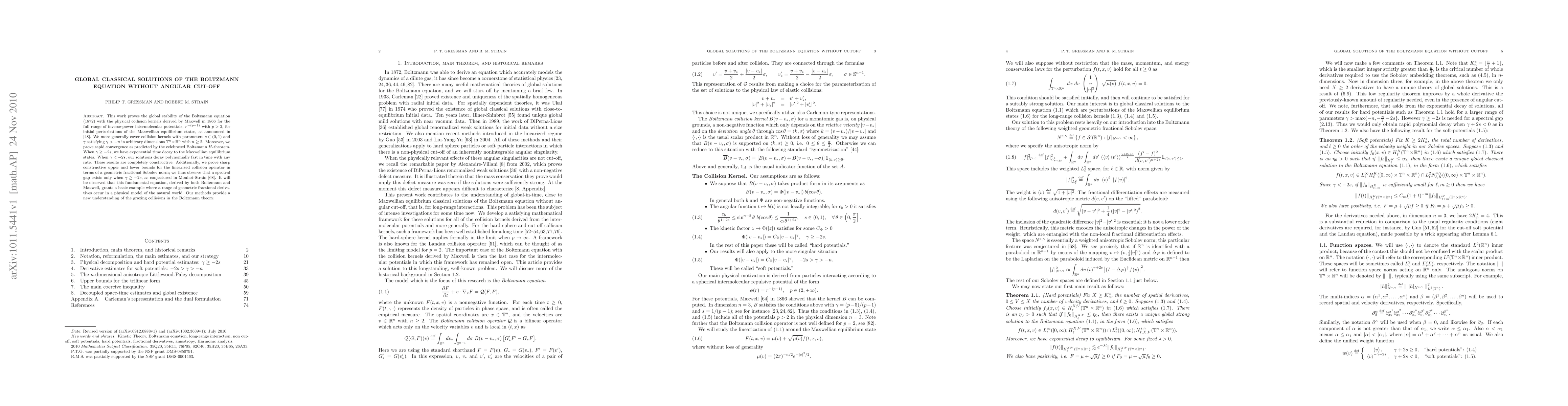 This work proves the global stability of the Boltzmann equation (1872) with the physical collision kernels derived by Maxwell in 1866 for the full range of inverse-power intermolecular potentials, $r^{-(p-1)}$ with $p>2$, for initial perturbations of the Maxwellian equilibrium states, as announced in \cite{gsNonCutA}. We more generally cover collision kernels with parameters $s\in (0,1)$ and $\gamma$ satisfying $\gamma > -n$ in arbitrary dimensions $\mathbb{T}^n \times \mathbb{R}^n$ with $n\ge 2$. Moreover, we prove rapid convergence as predicted by the celebrated Boltzmann $H$-theorem. When $\gamma \ge -2s$, we have exponential time decay to the Maxwellian equilibrium states. When $\gamma <-2s$, our solutions decay polynomially fast in time with any rate. These results are completely constructive. Additionally, we prove sharp constructive upper and lower bounds for the linearized collision operator in terms of a geometric fractional Sobolev norm; we thus observe that a spectral gap exists only when $\gamma \ge -2s$, as conjectured in Mouhot-Strain \cite{MR2322149}. It will be observed that this fundamental equation, derived by both Boltzmann and Maxwell, grants a basic example where a range of geometric fractional derivatives occur in a physical model of the natural world. Our methods provide a new understanding of the grazing collisions in the Boltzmann theory.