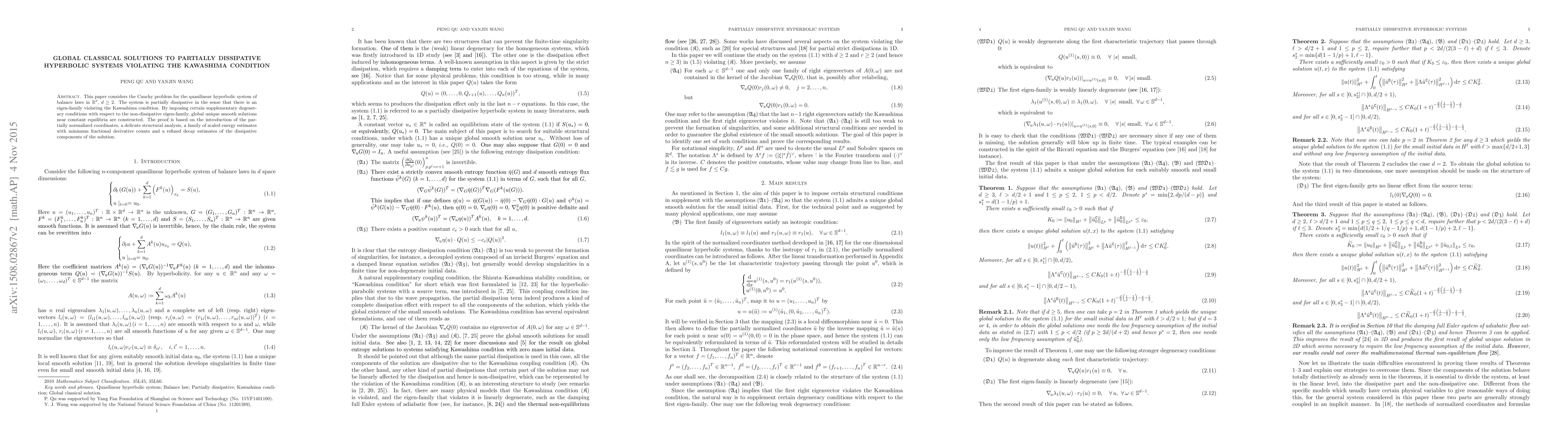 This paper considers the Cauchy problem for the quasilinear hyperbolic system of balance laws in $\mathbb{R}^d$, $d\ge 2$. The system is partially dissipative in the sense that there is an eigen-family violating the Kawashima condition. By imposing certain supplementary degeneracy conditions with respect to the non-dissipative eigen-family, global unique smooth solutions near constant equilibria are constructed. The proof is based on the introduction of the partially normalized coordinates, a delicate structural analysis, a family of scaled energy estimates with minimum fractional derivative counts and a refined decay estimates of the dissipative components of the solution.