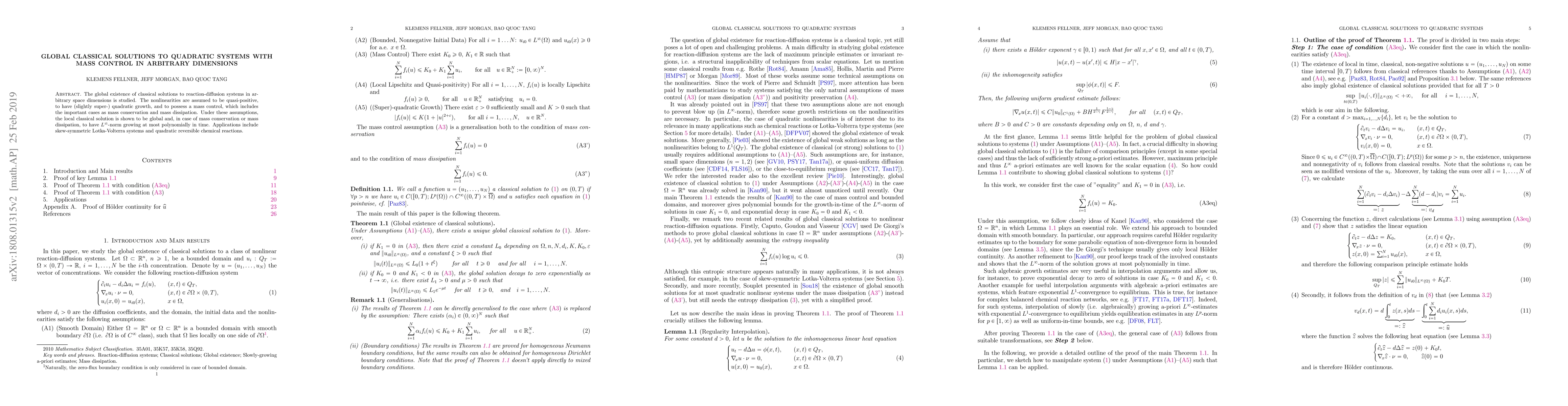 The global existence of classical solutions to reaction-diffusion systems in arbitrary space dimensions is studied. The nonlinearities are assumed to be quasi-positive, to have (slightly super-) quadratic growth, and to possess a mass control, which includes the important cases as mass conservation and mass dissipation. Under these assumptions, the local classical solution is shown to be global and, in case of mass conservation or mass dissipation, to have $L^{\infty}$-norm growing at most polynomially in time. Applications include skew-symmetric Lotka-Volterra systems and quadratic reversible chemical reactions.