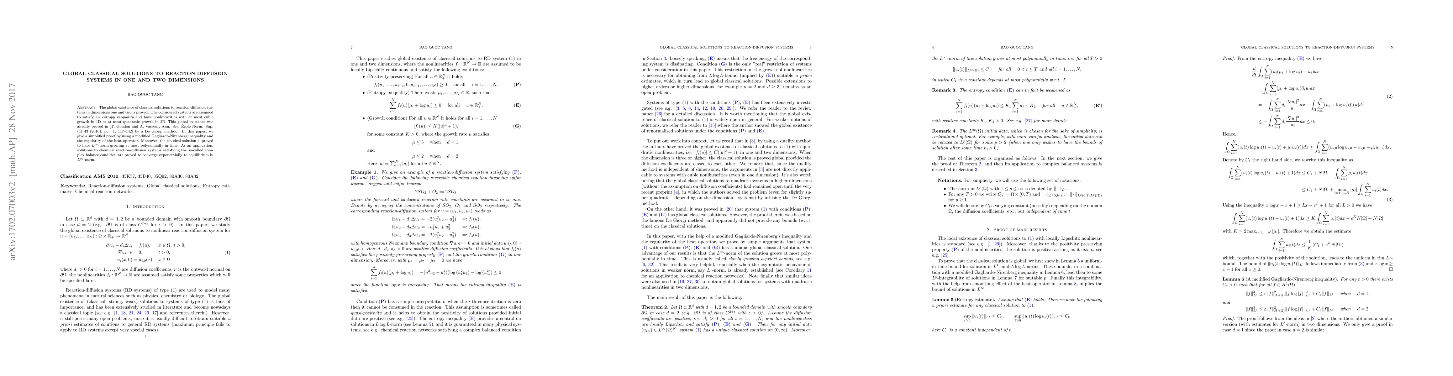This paper proves the global existence of classical solutions to reaction-diffusion systems in one and two dimensions using a simplified proof method. It shows that solutions grow at most polynomially in time and applies the results to chemical reaction-diffusion systems converging exponentially to equilibrium.