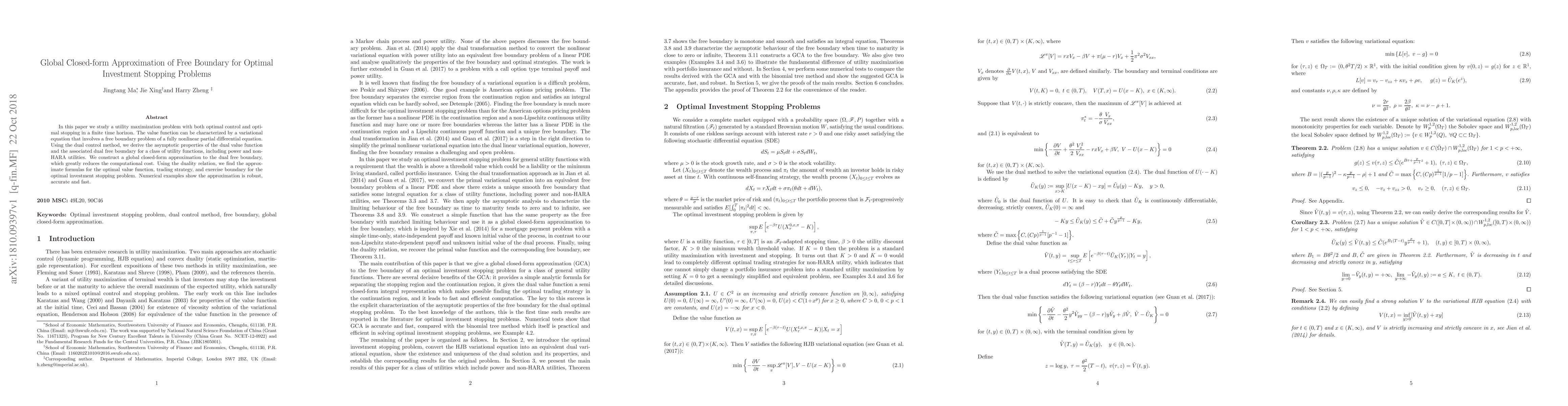 This paper develops a global closed-form approximation for the free boundary in optimal investment and stopping problems, significantly reducing computational costs. It utilizes the dual control method to derive properties of the dual value function and constructs accurate approximations for the optimal value function, trading strategy, and exercise boundary.